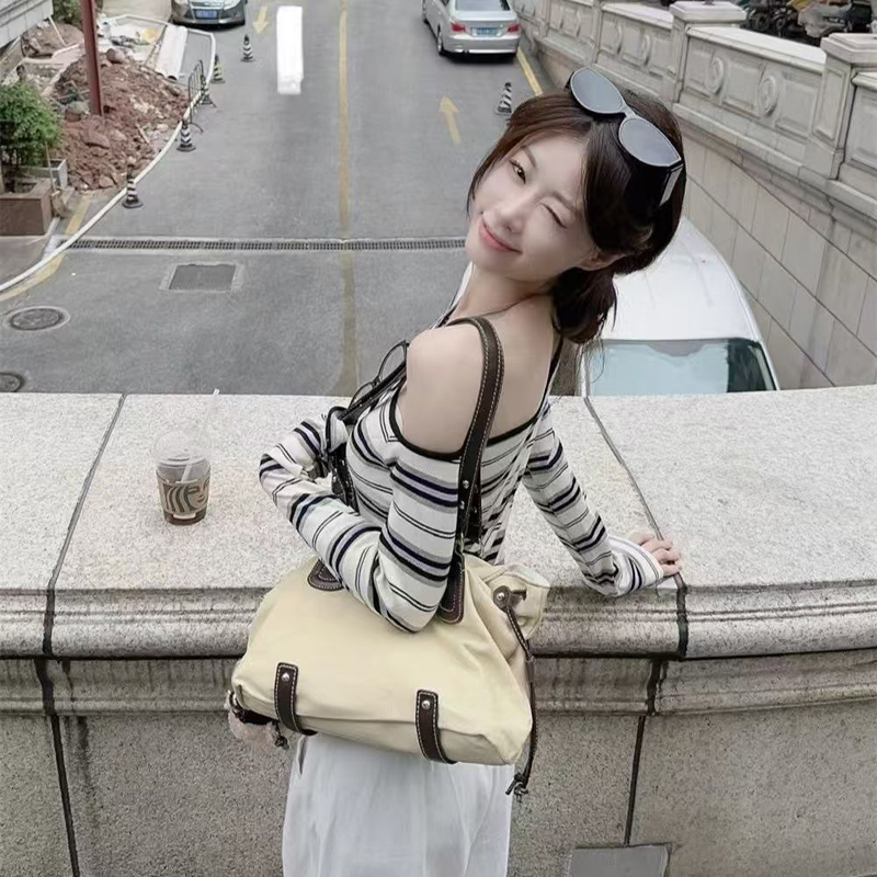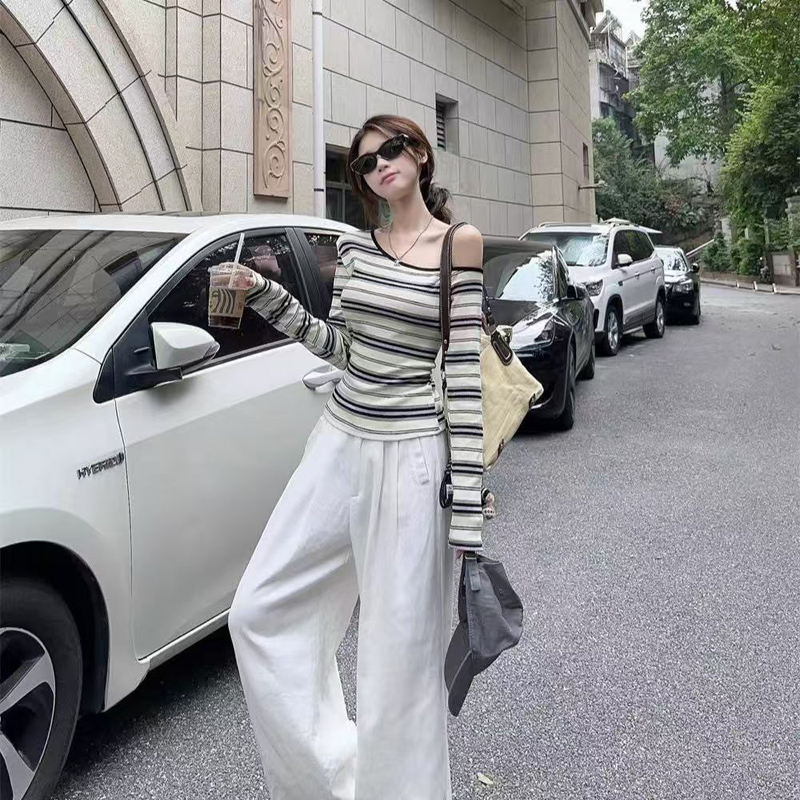 YF6462-图片色辣妹时尚露单肩设计条纹圆领长袖弹力收腰显瘦韩版打底衫