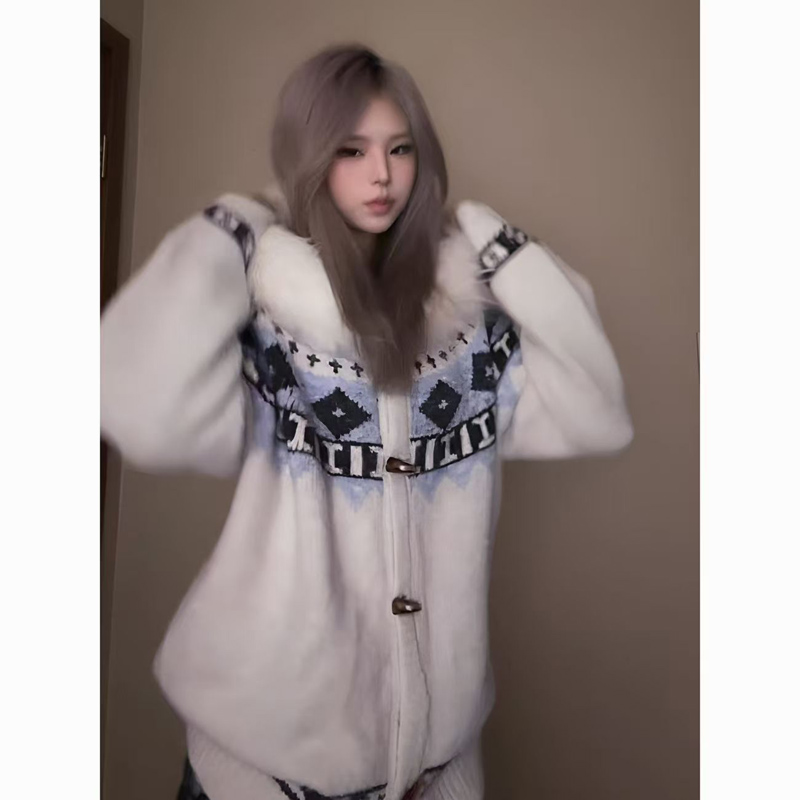 YF6463-(2色入内)慵懒风冬季牛角扣毛毛领连帽雪花提花宽松大码高级感针织上衣