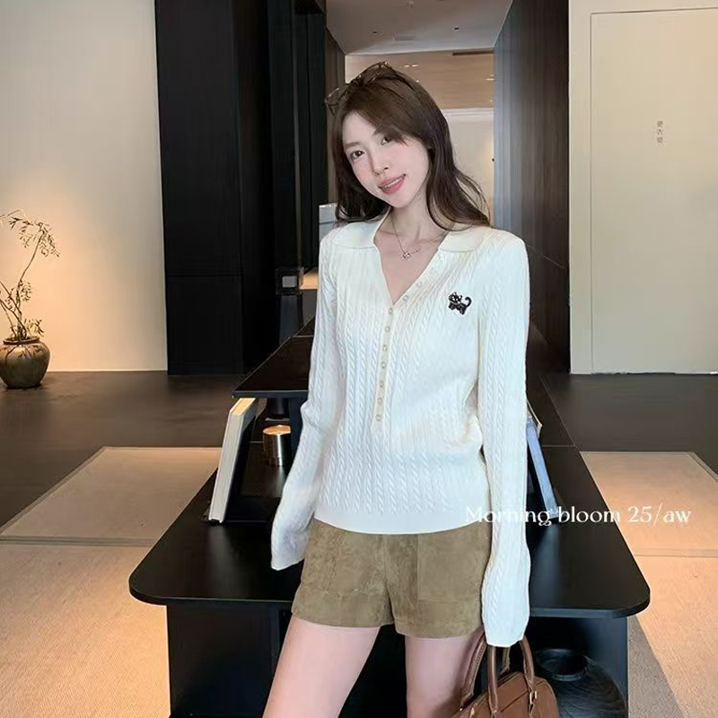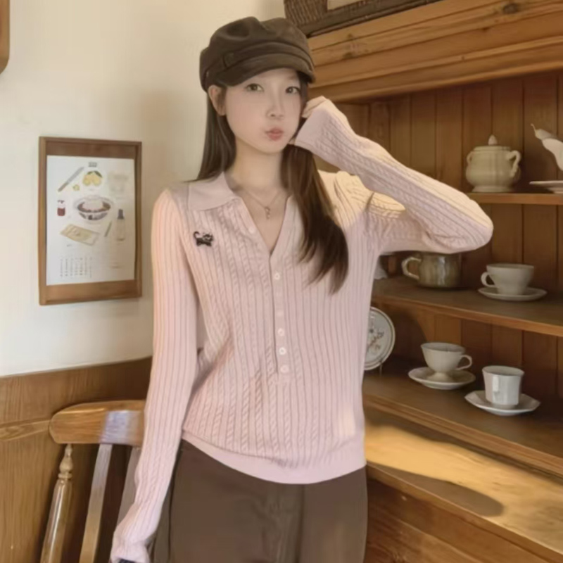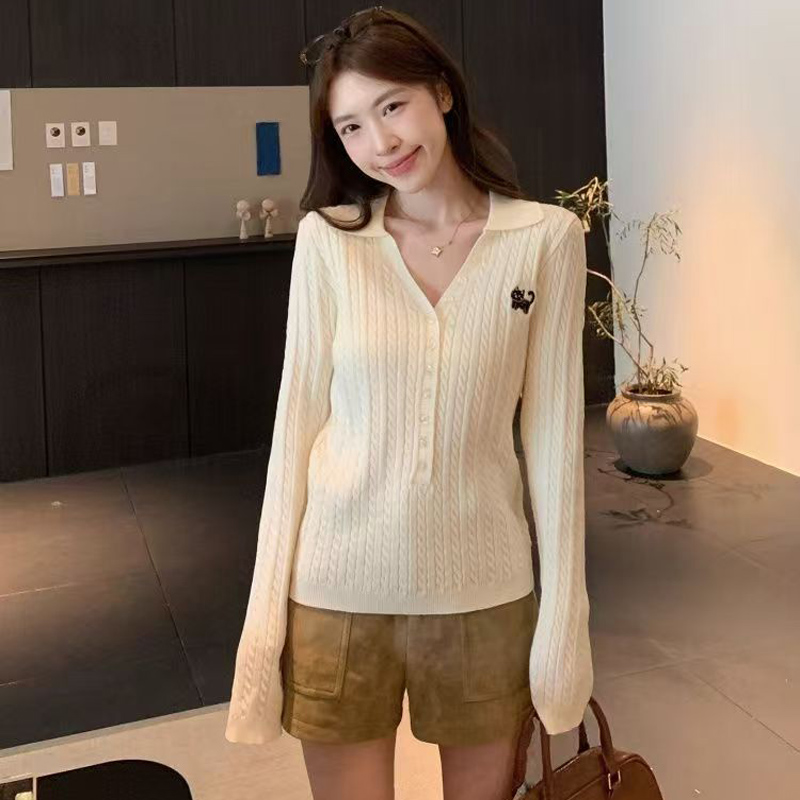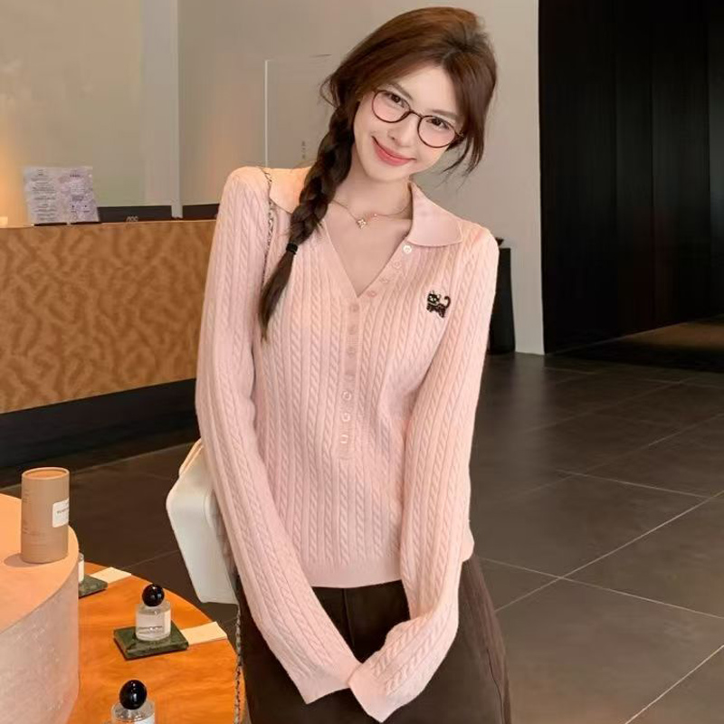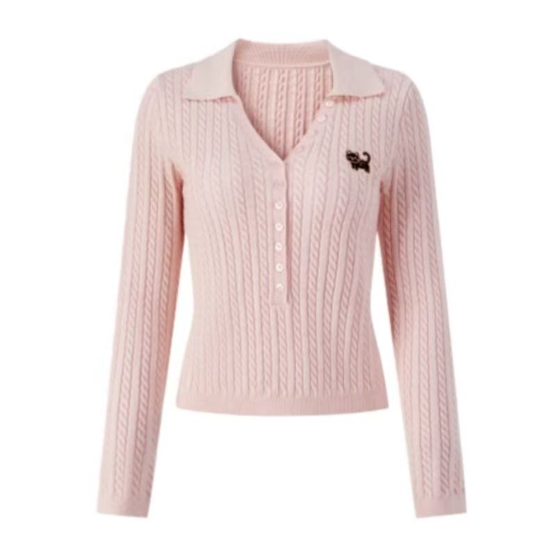 YF6464-(2色入内)可爱猫猫刺绣POLO领长袖系扣麻花纹复古秋冬显瘦针织上衣