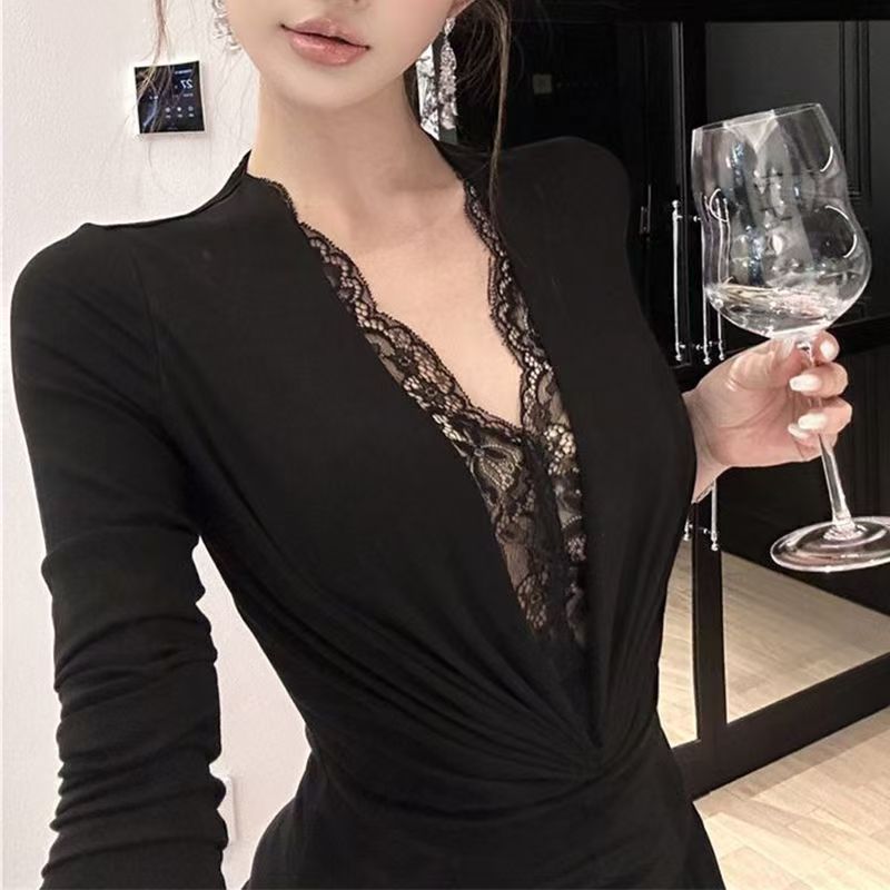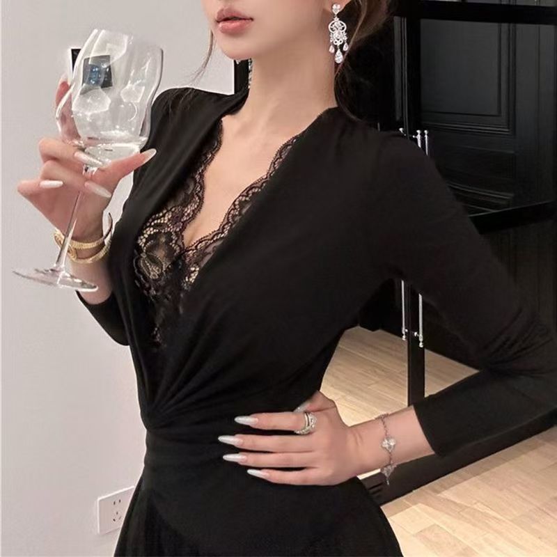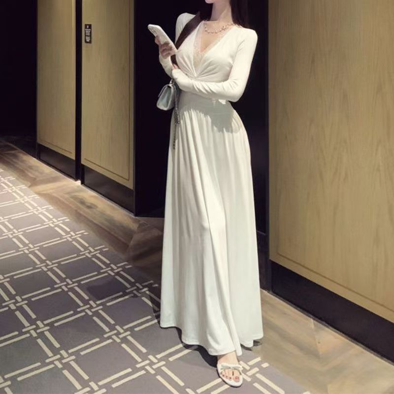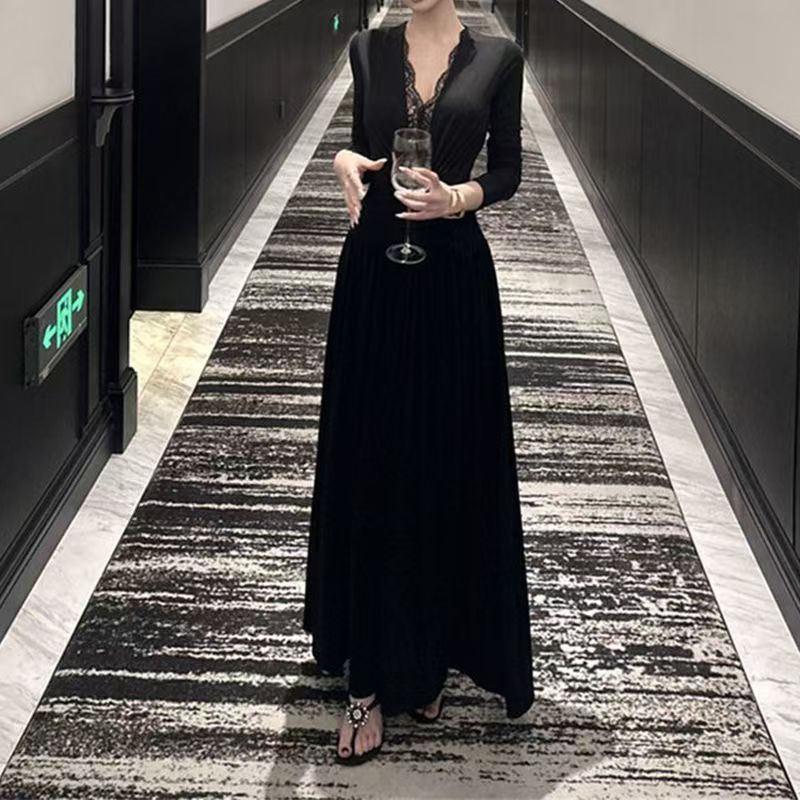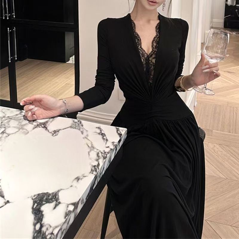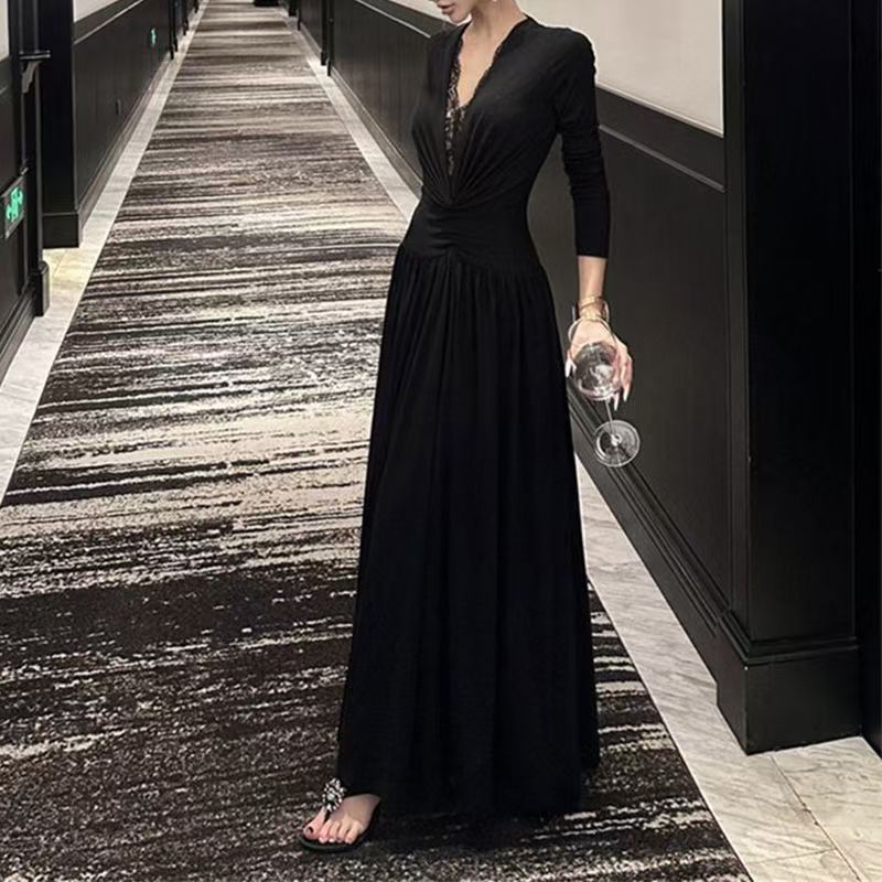 YF6566-(2色入内)法式优雅蕾丝拼接V字镂空纽纹修腰纯色复古气质赫本风连衣裙