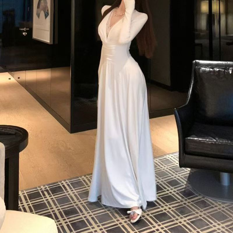 YF6465-(2色入内)简洁白色小仙女优雅气质方领长袖褶折收腰中长款赫本风连衣裙