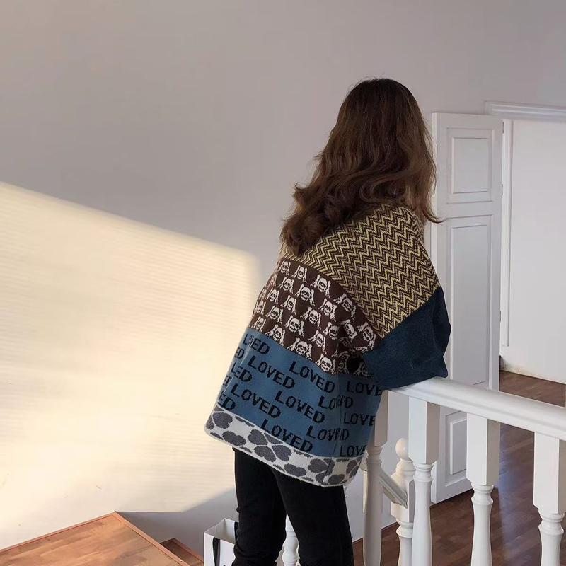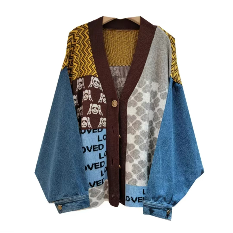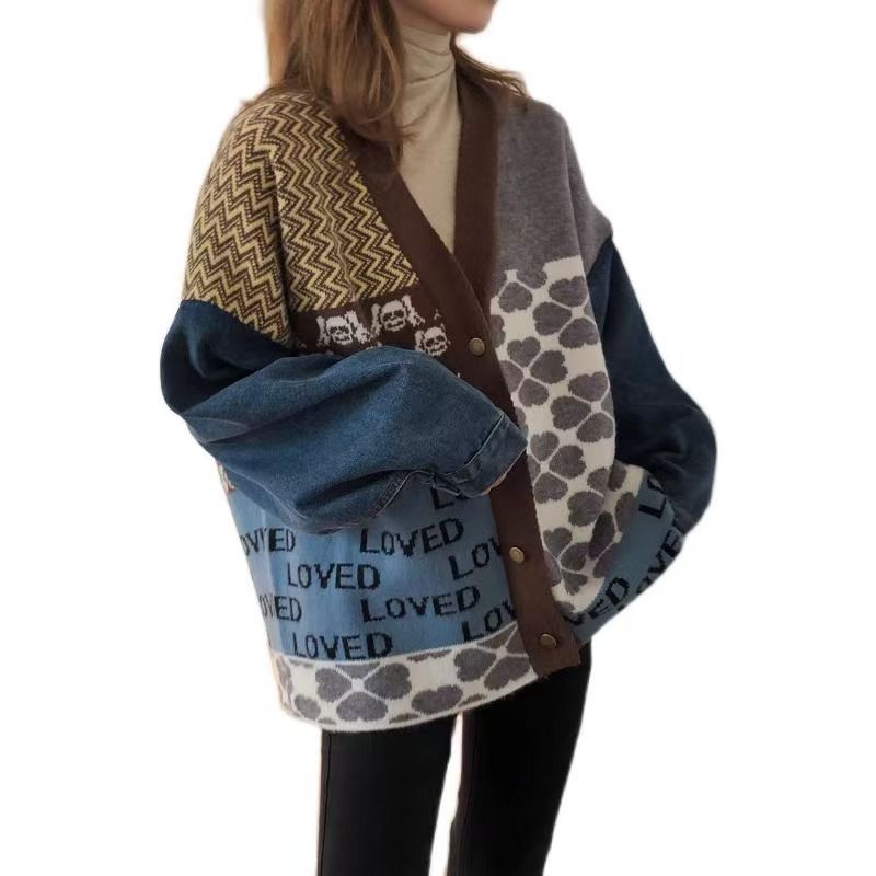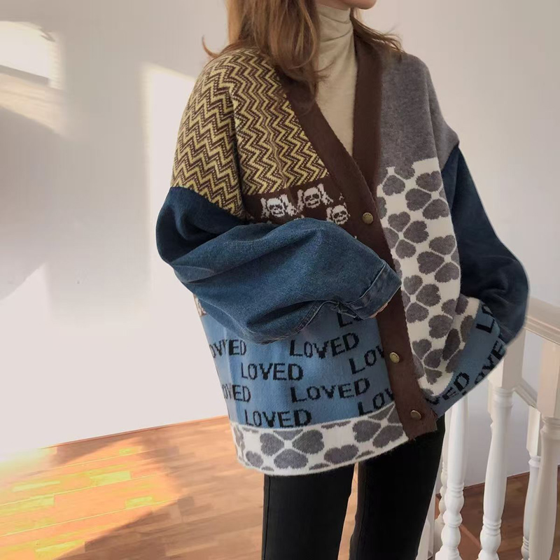 YF6468-图片色美式不规则字母爱心骷髅头提花撞色设计长袖系扣大码针织外套
