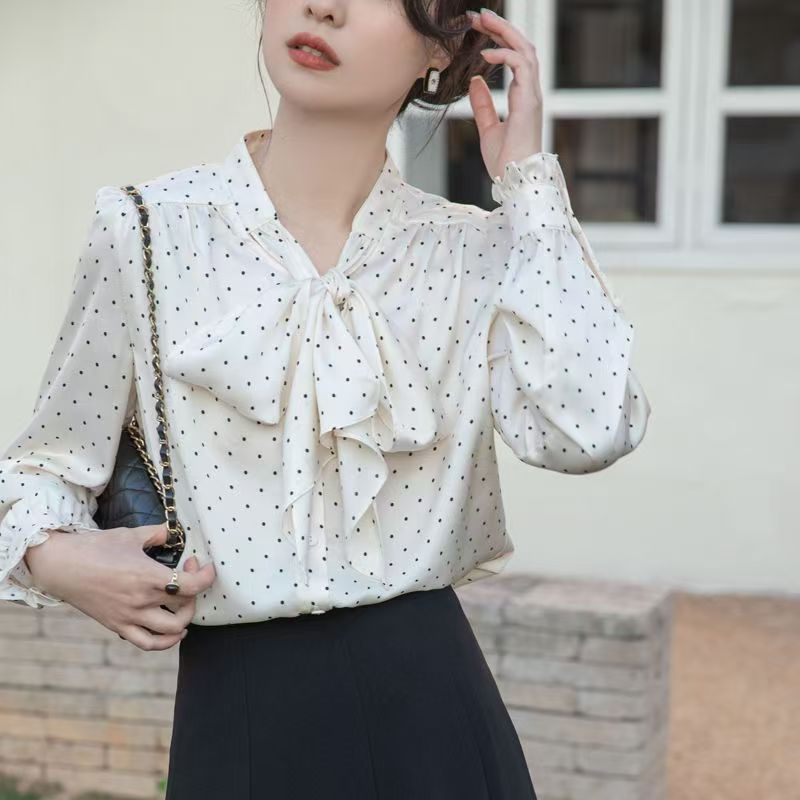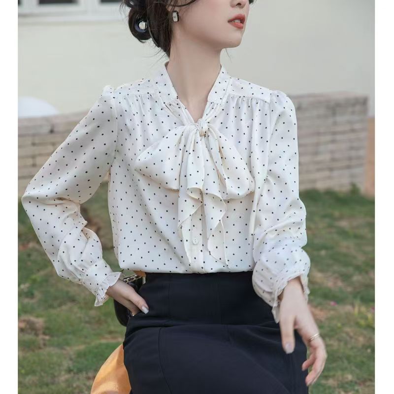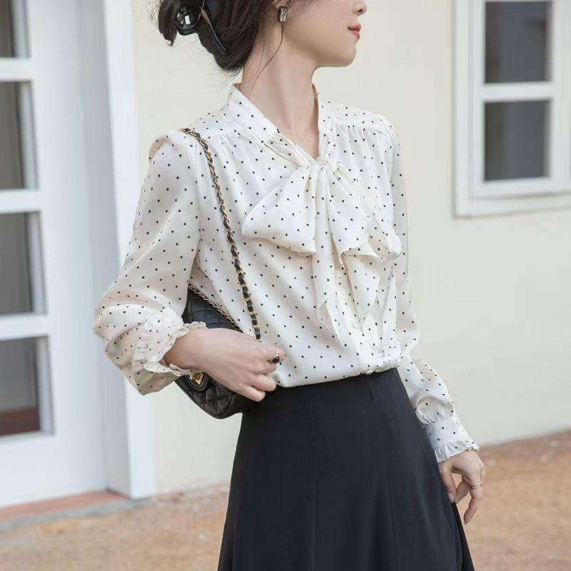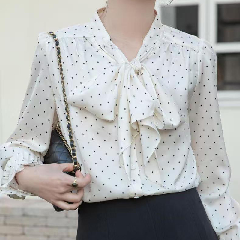 YF6469-图片色韩版甜美时尚蝴蝶结波点水木耳边长袖立领设计感大码雪纺衬衣