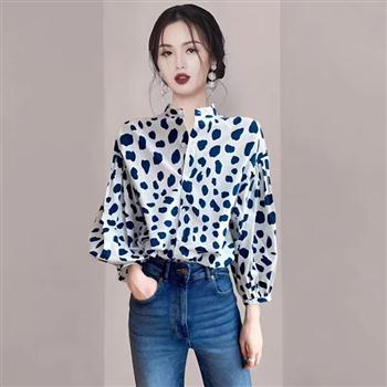 YF6703-图片色复古灯笼袖立领系扣斑点纹印花宽松大码春秋百搭新款上衣
