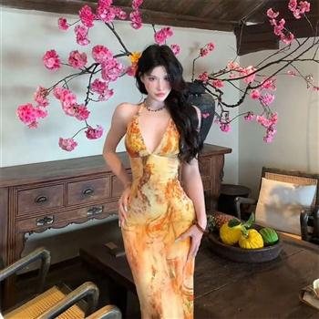 YF6707-图片色名媛宴会礼服 时尚性感扎染吊带纯欲风挂脖包臀拖地长裙