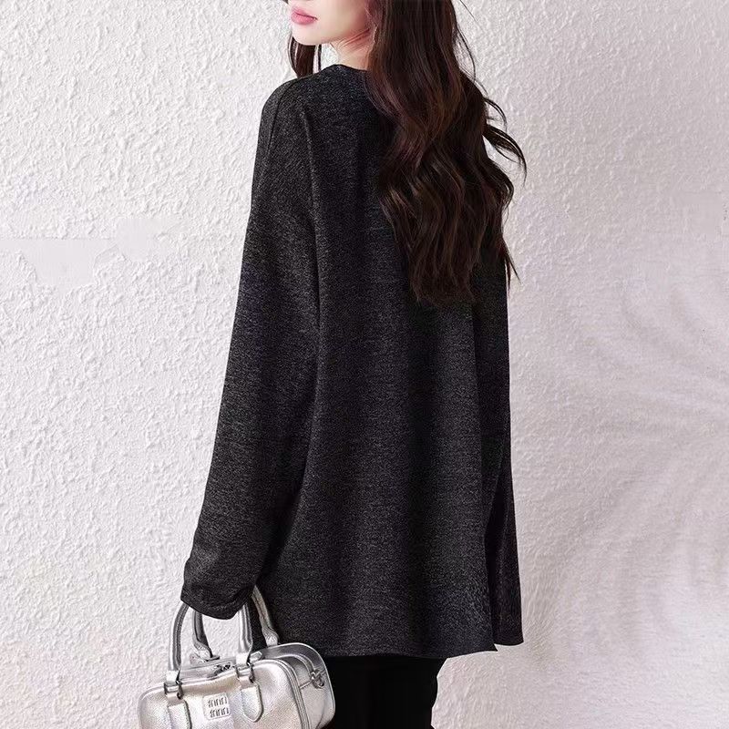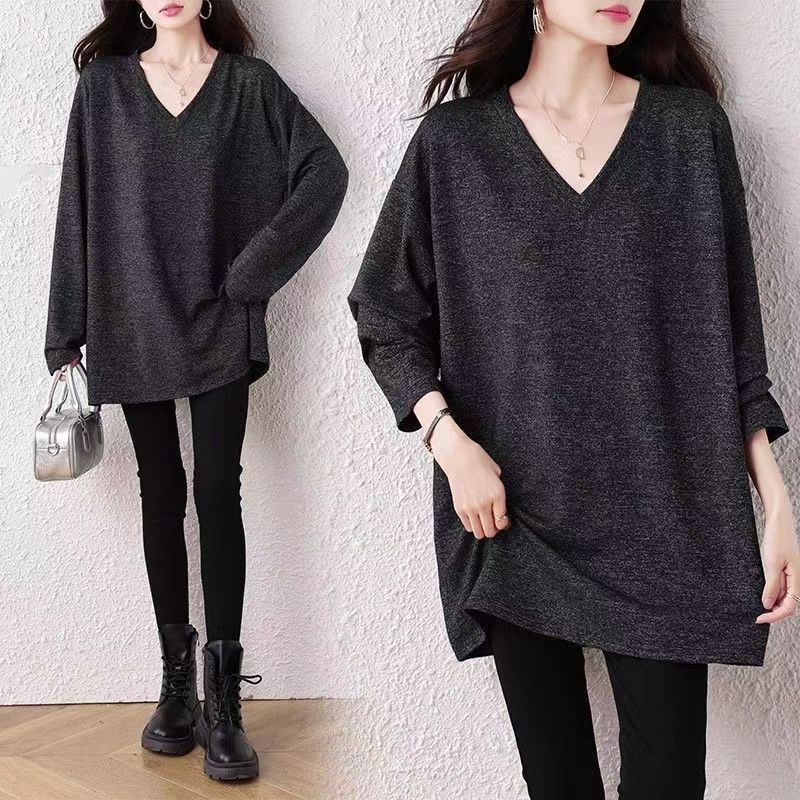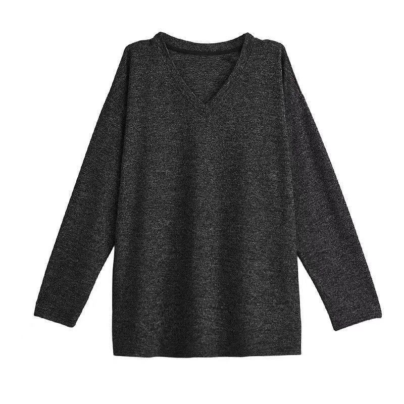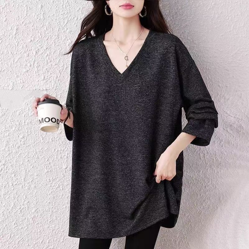 YF6492-图片色春秋大码显瘦V领慵懒风港式中长款时尚百搭纯色休闲潮T恤