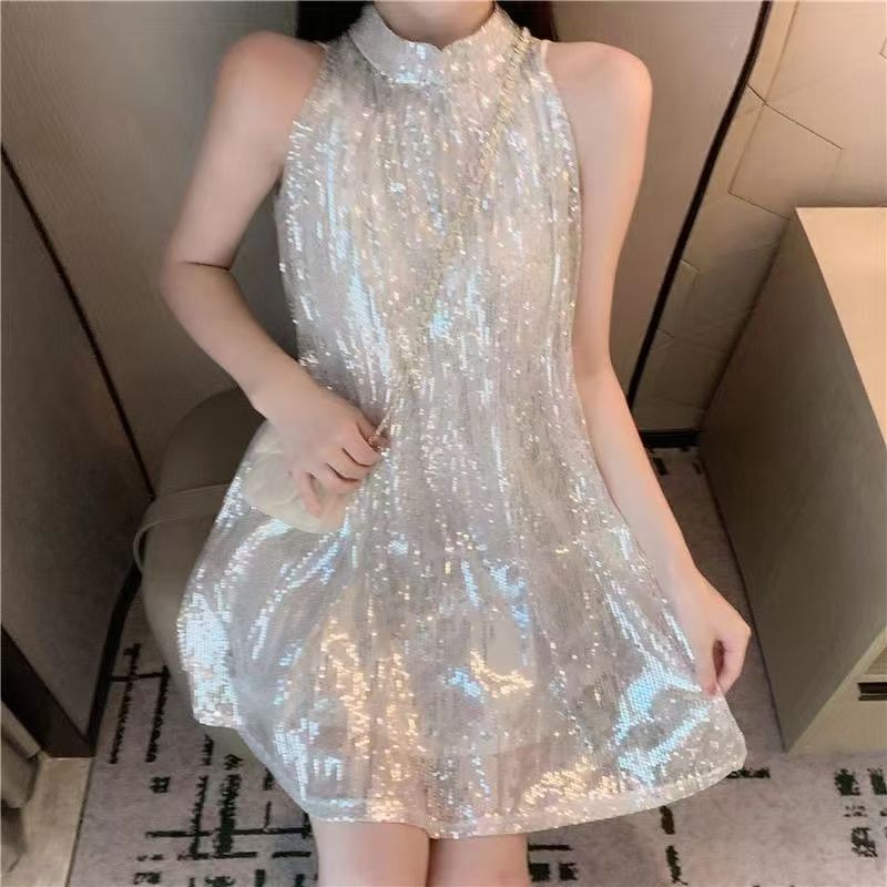 YF6602-(2色入内)高级感无袖围脖A字闪闪亮片小众设计宽松大码小礼服短裙