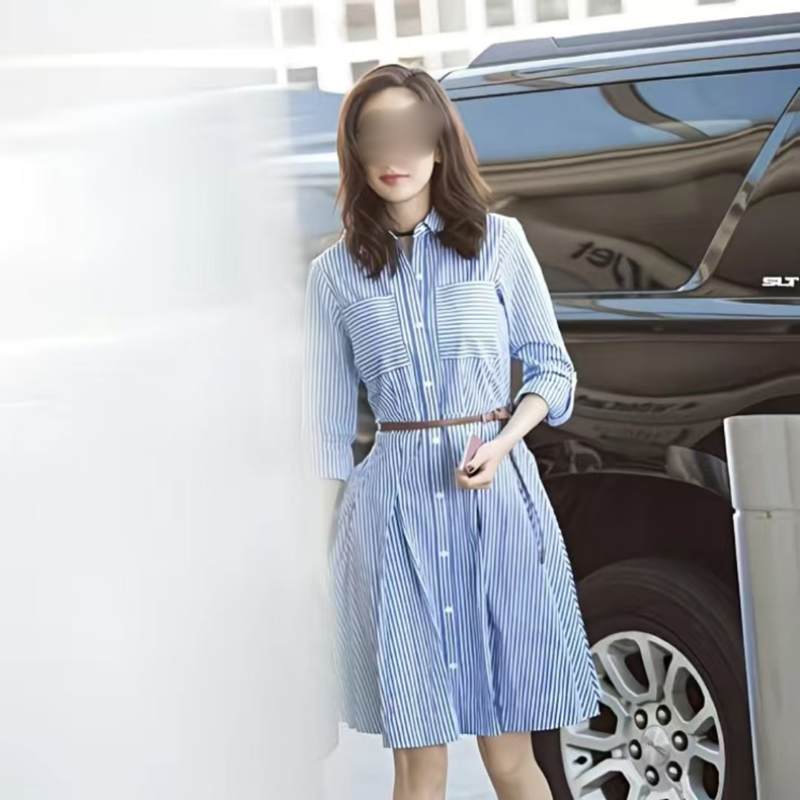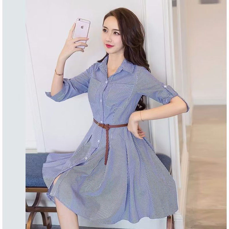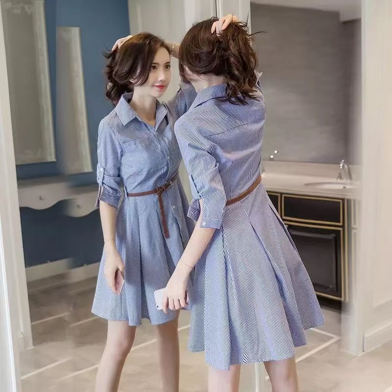 YF6508-图片色春秋百搭可调长袖POLO领条纹显瘦洋气个性设计衬衣连衣裙