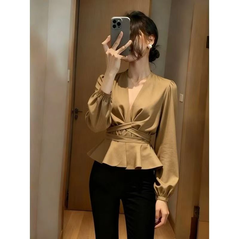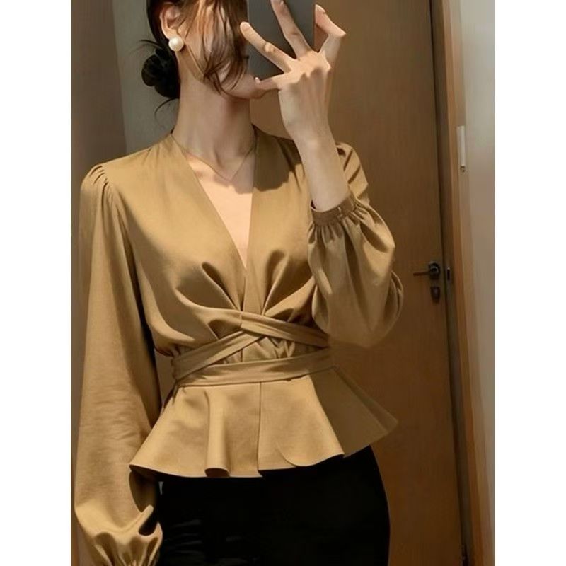 YF6513-图片色法式复古绑带系腰泡泡袖V领荷叶边独特气质短款上衣新款