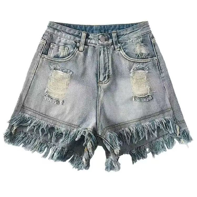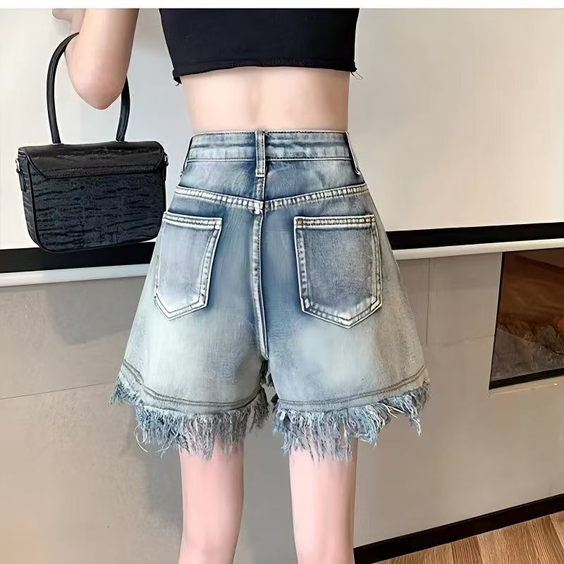 YF6516-图片色韩版辣妹百搭系扣高腰流苏洗水破洞设计A字阔腿牛仔短裤