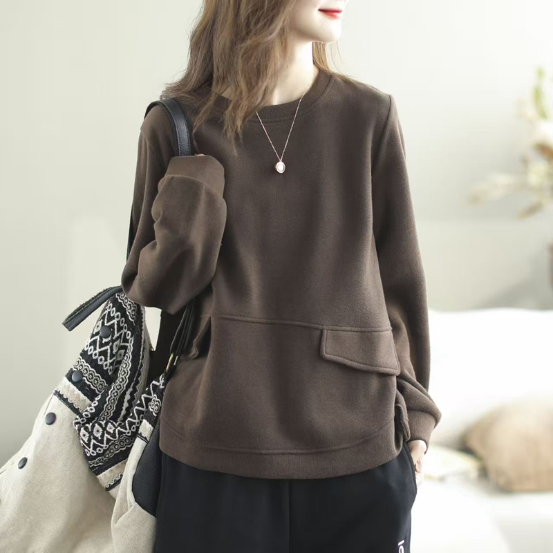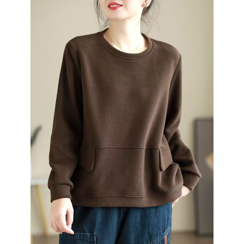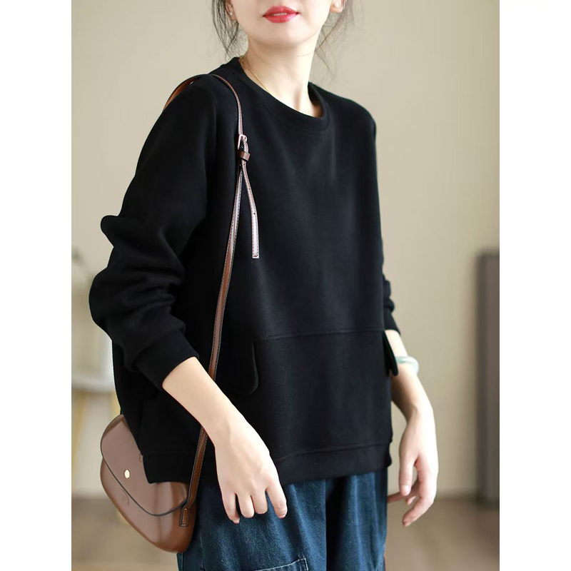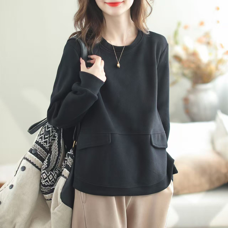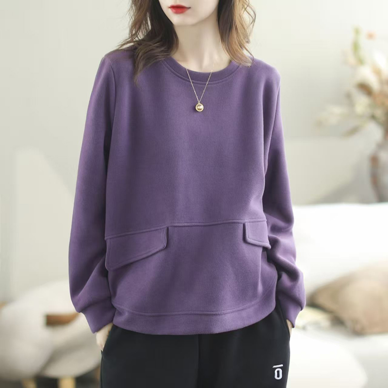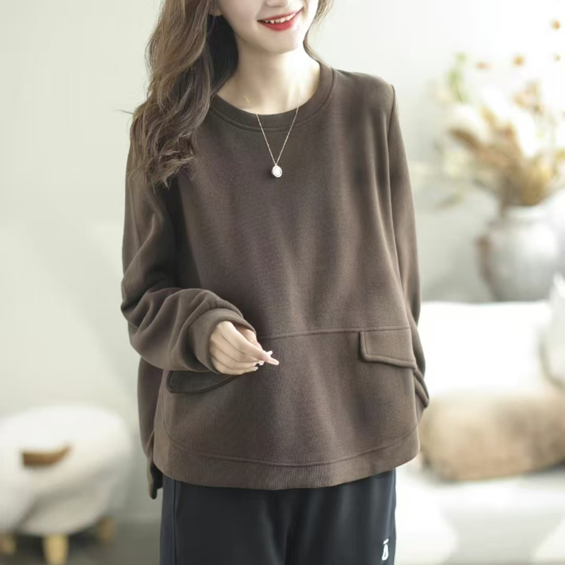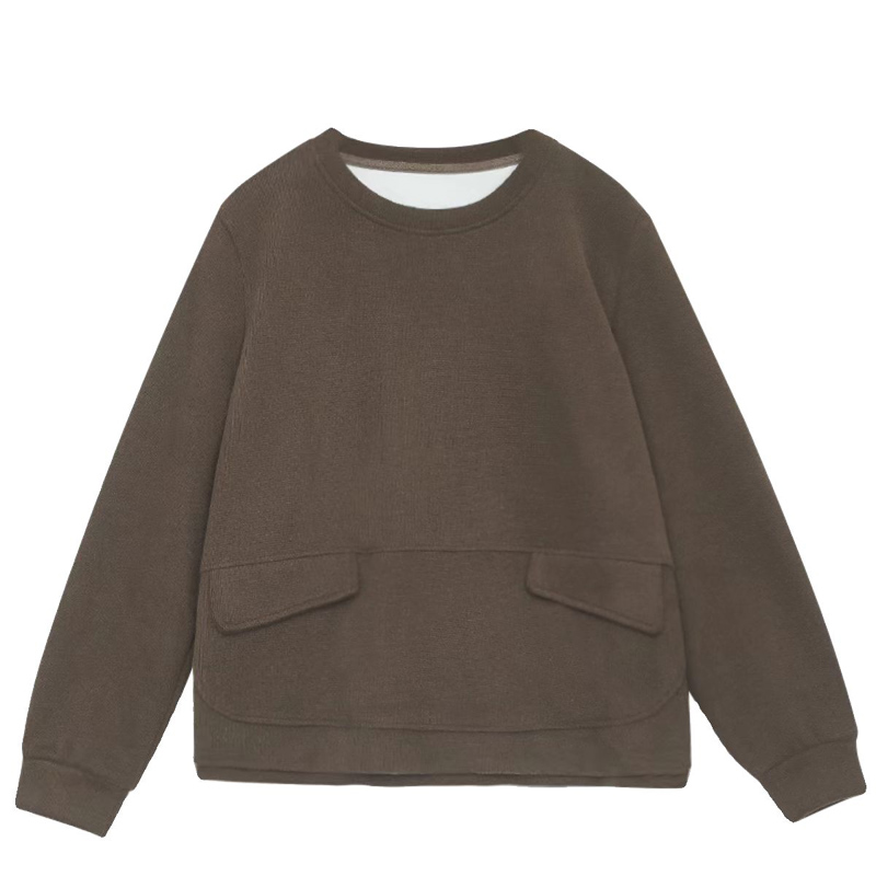 YF6517-(3色入内)韩版圆领长袖宽松大码复古设计双口袋拼接感简约感卫衣潮