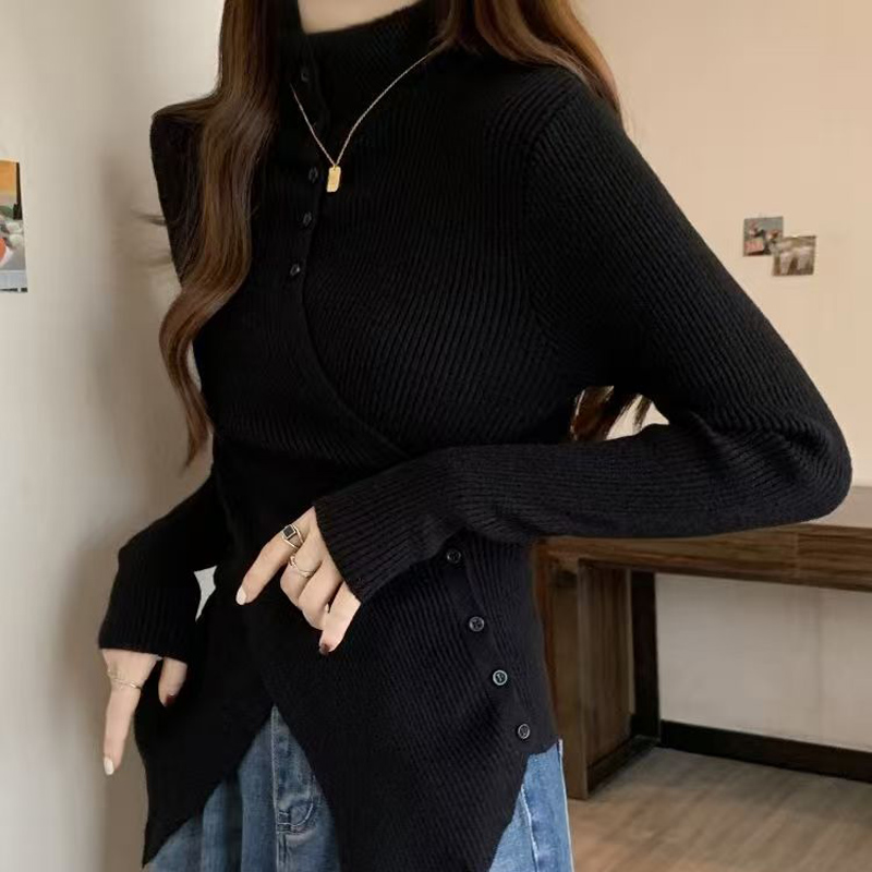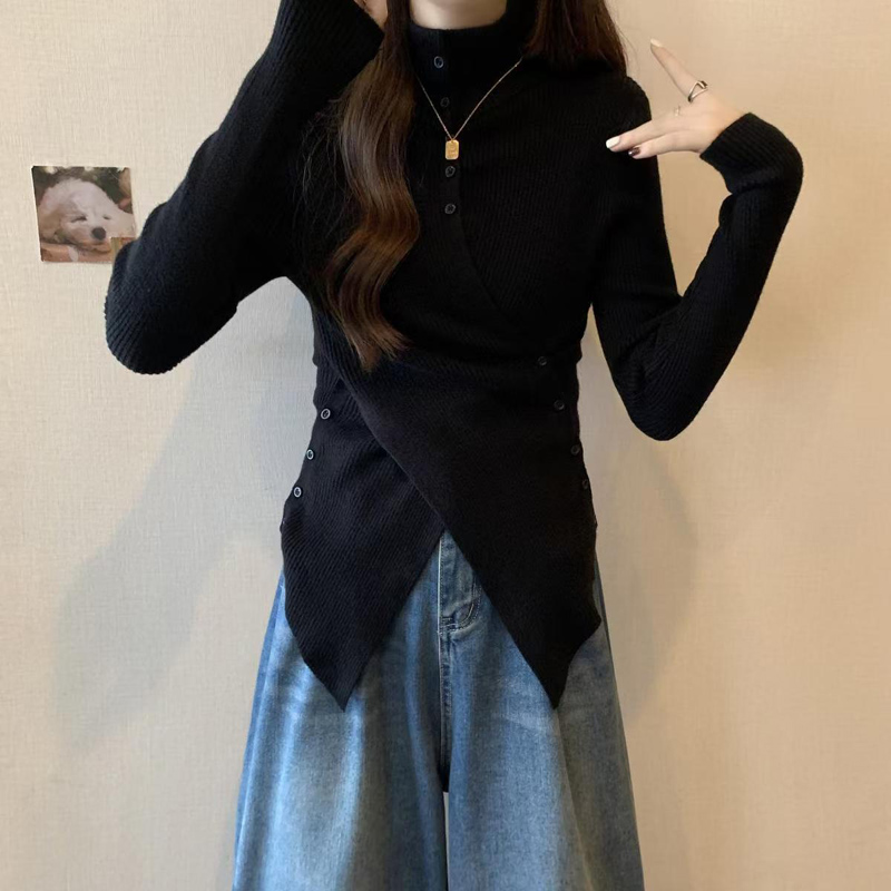 YF6521-(4色入内)洋气小众设计高领系扣不规则弧边交叉修腰显瘦针织上衣