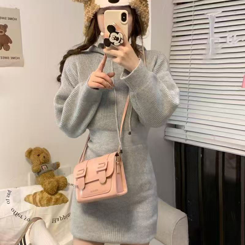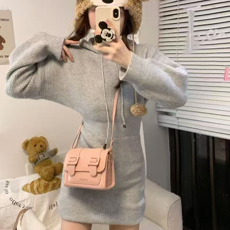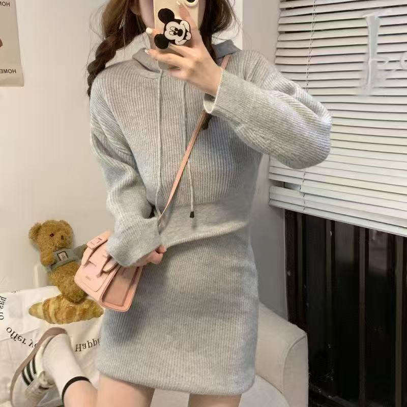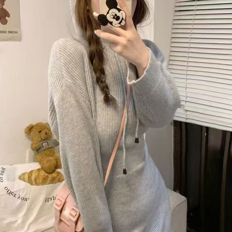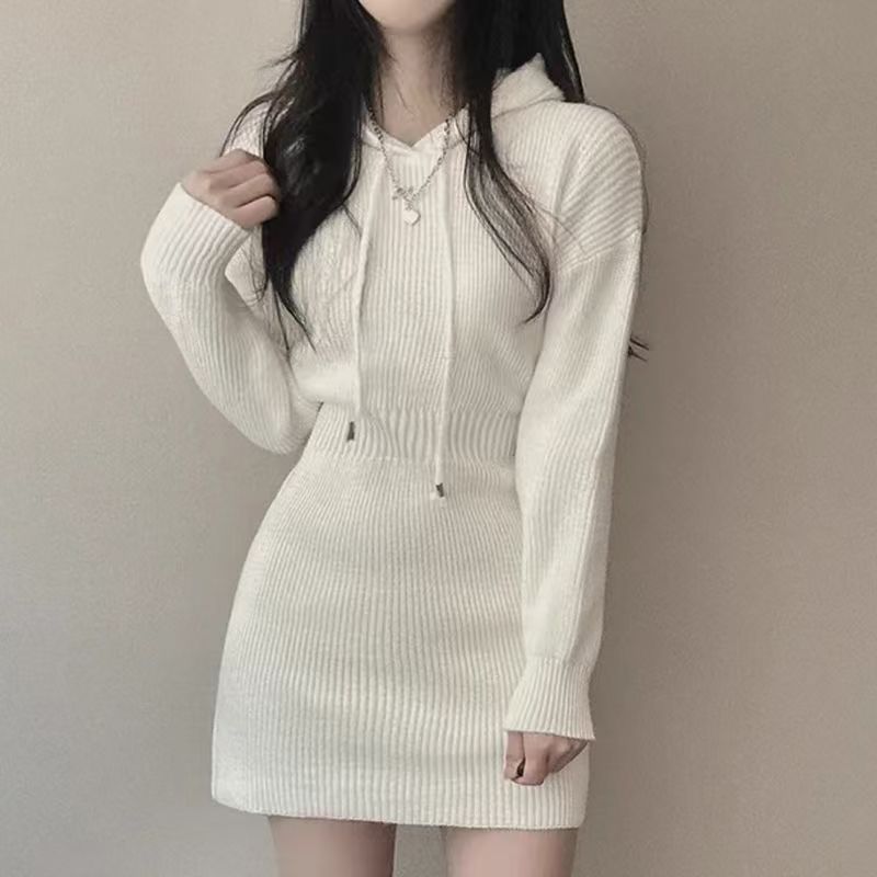 YF6522-(3色入内)韩版甜美时尚长袖连帽抽绳防风束腰包臀加厚针织连衣裙