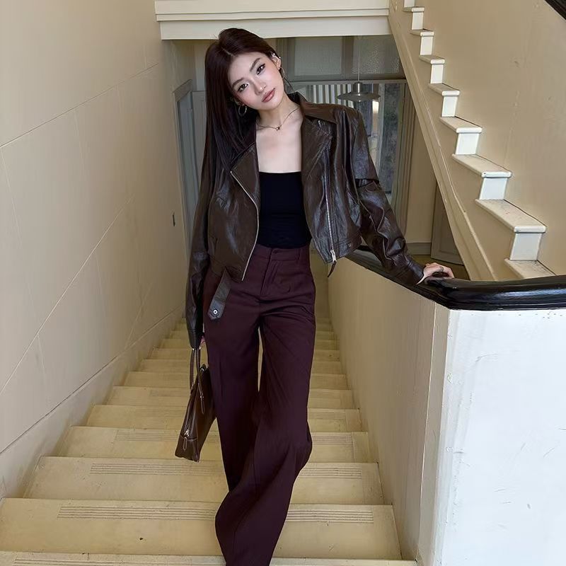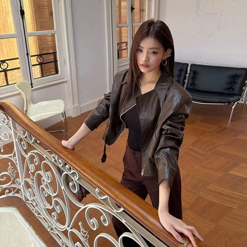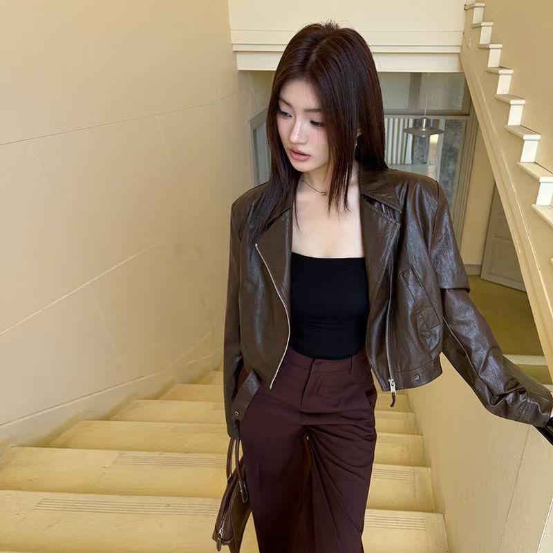 YF6527-图片色辣妹新款机车设计长袖POLO领拉链短款PU皮冬季夹克外套