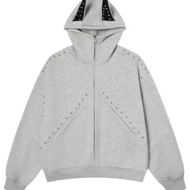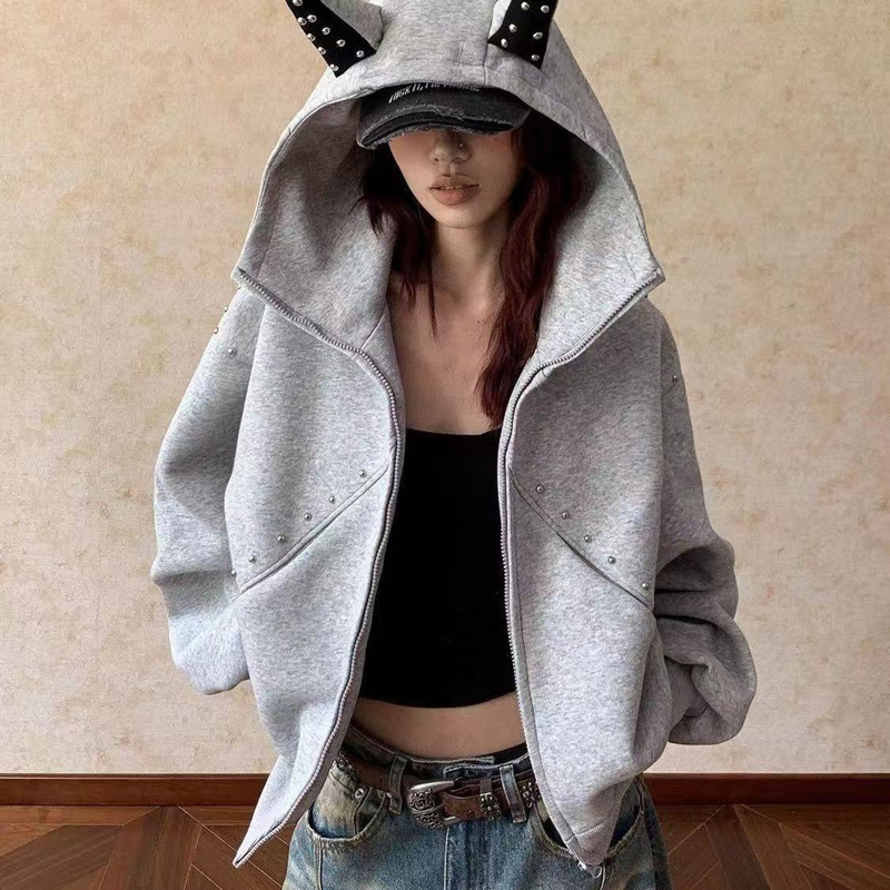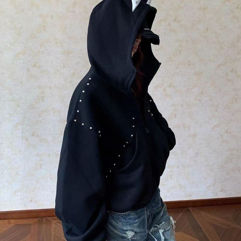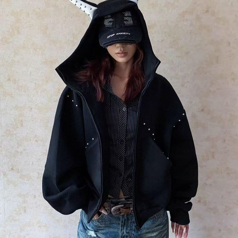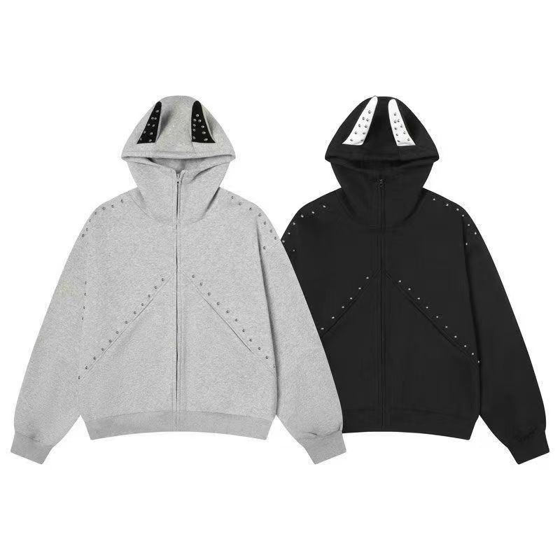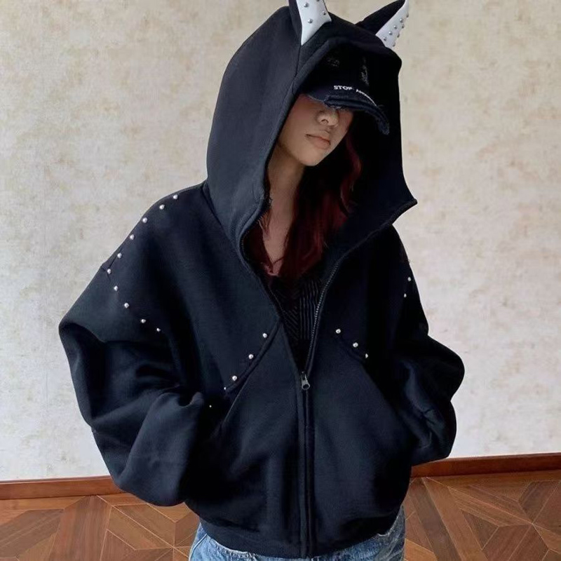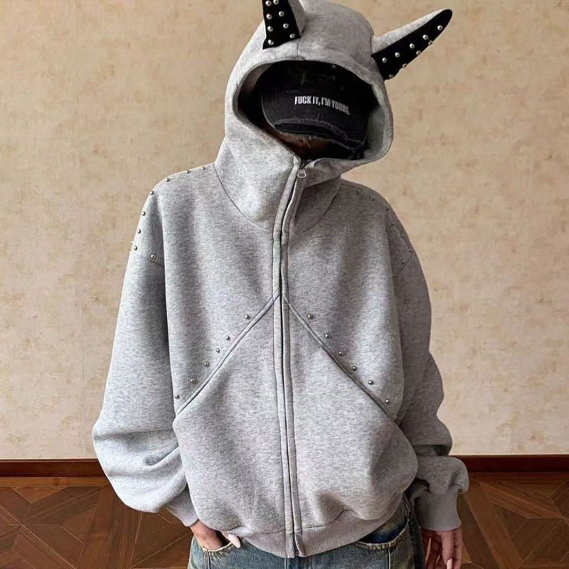 YF6633-(2色入内)慵懒风街头嘻哈个性牛角连帽柳钉设计长袖大码加厚卫衣
