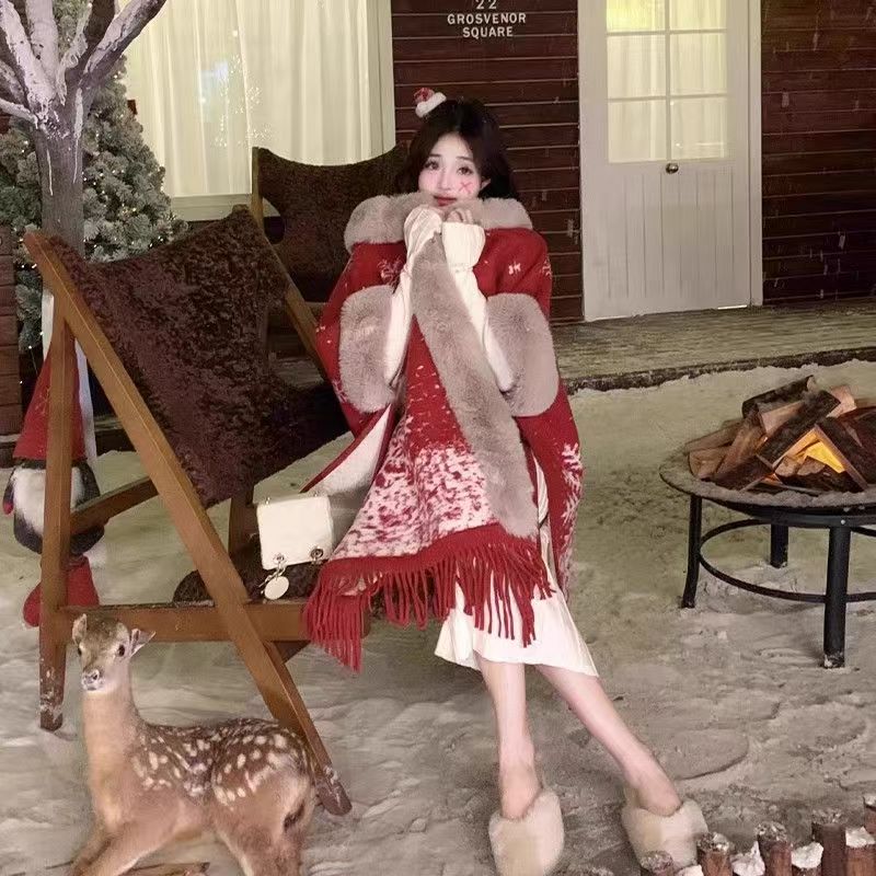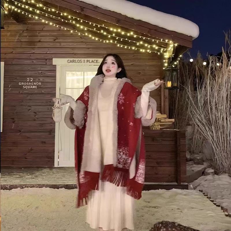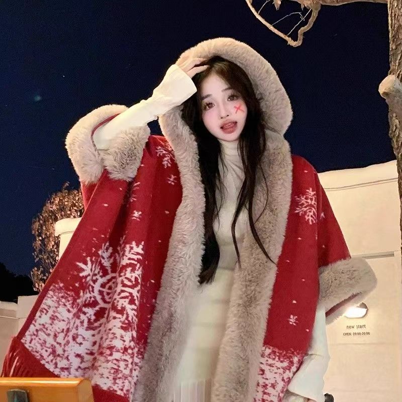 YF6639-图片色时尚红色羊羔绒围边雪花提花流苏设计加绒加厚披肩斗蓬外套