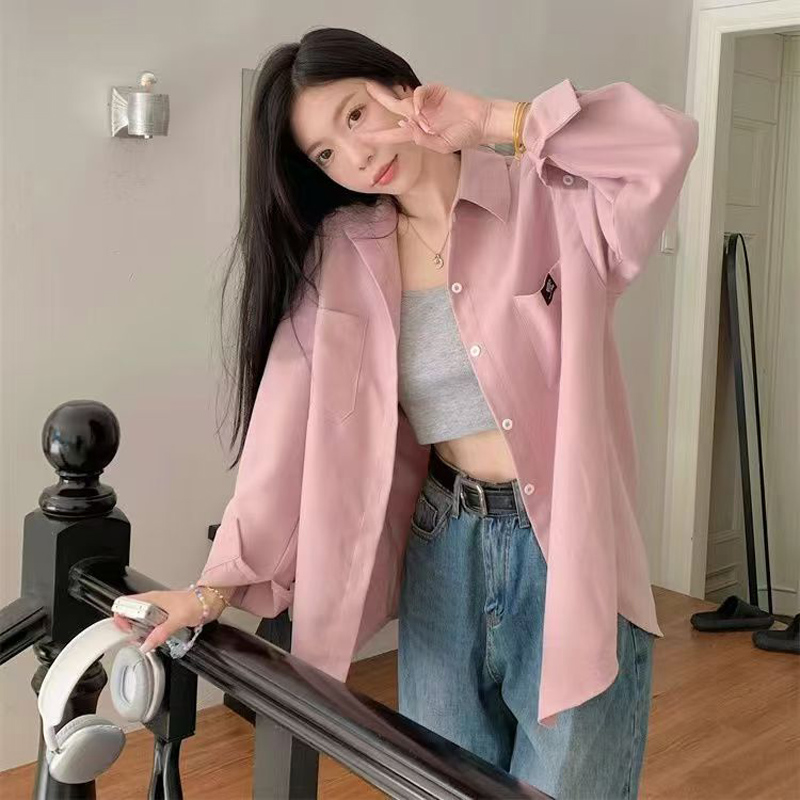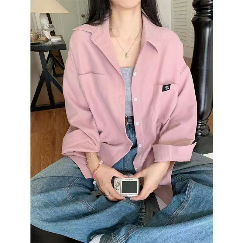 YF6475-图片韩版慵懒风复古格子大码春秋百搭长袖翻领粉色小清新衬衣新款