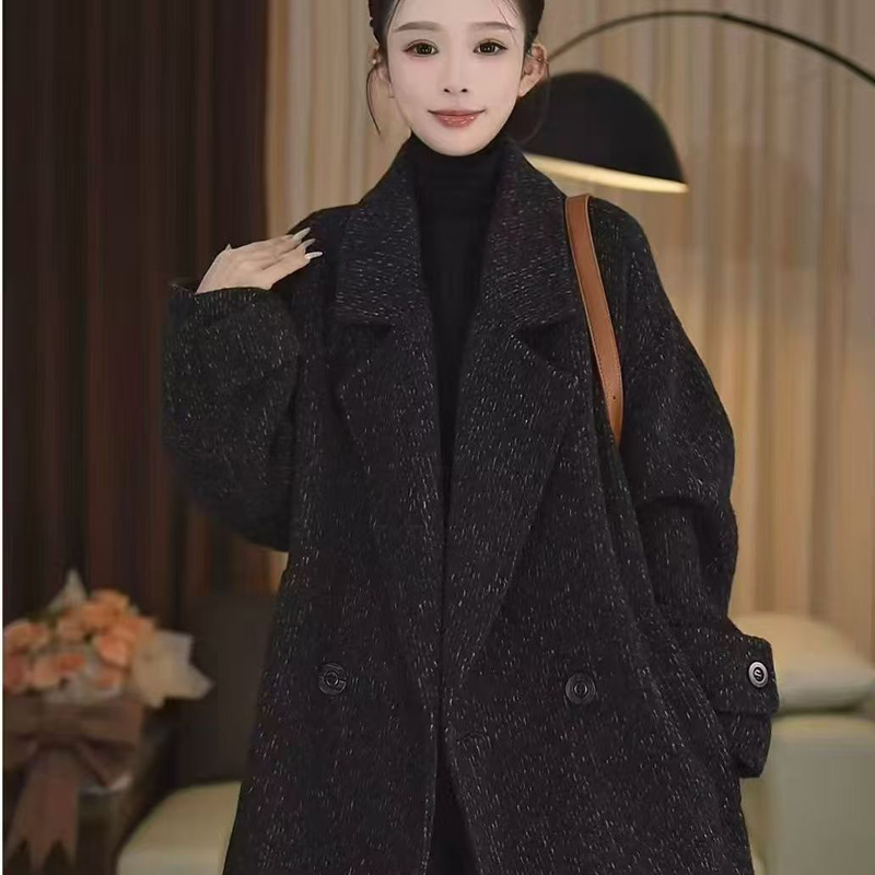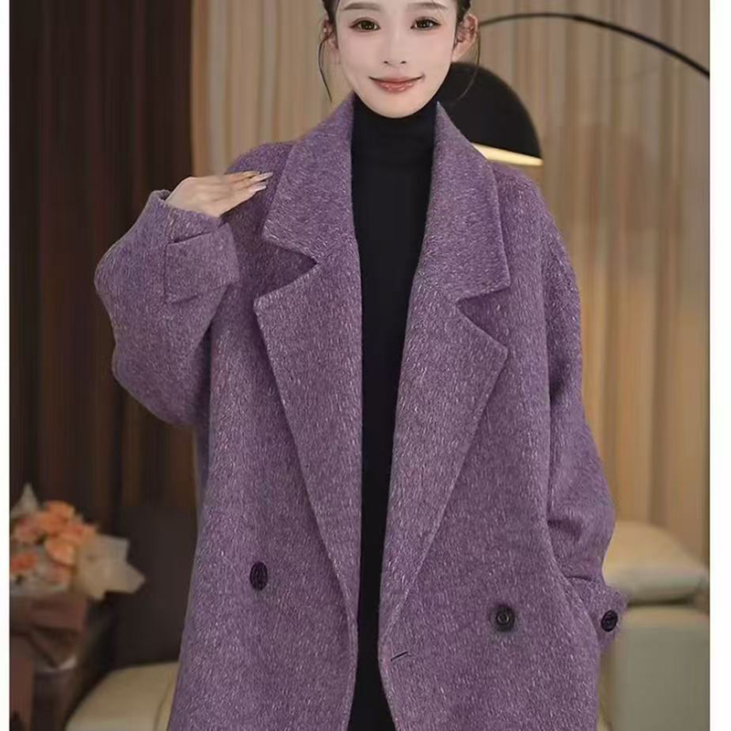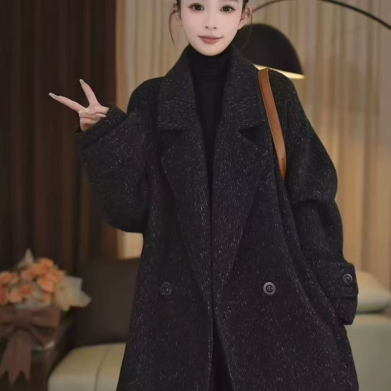 YF6657-(2色入内)双面呢加绒加厚系带袖子西装翻领双排扣英伦风中长款毛呢外套