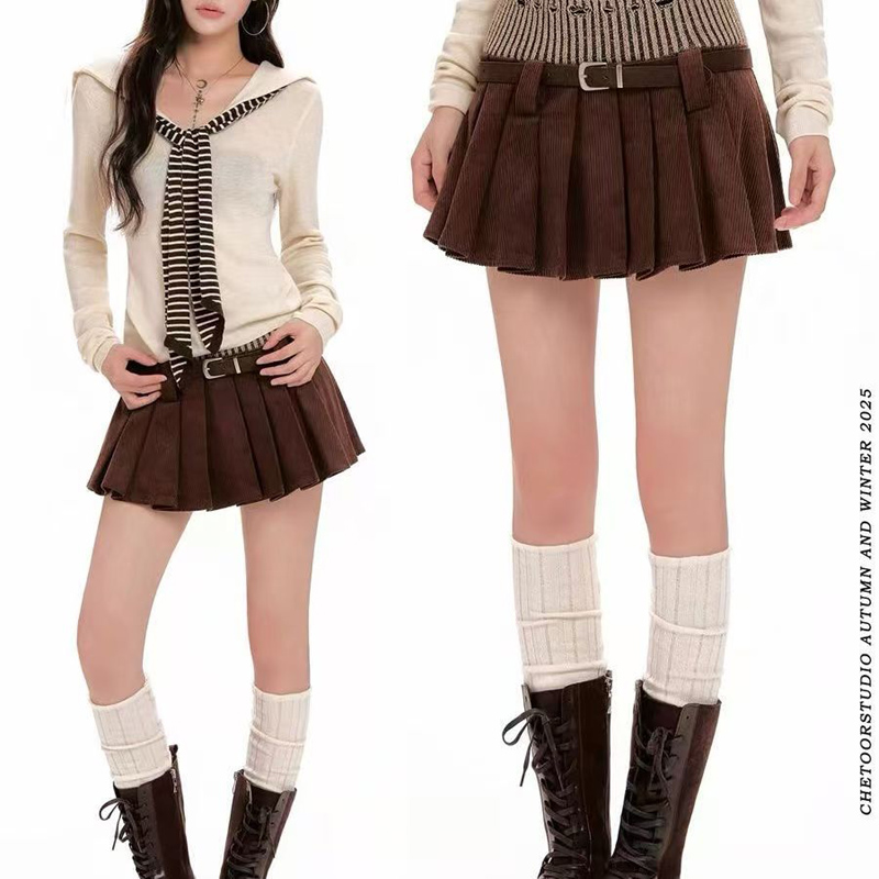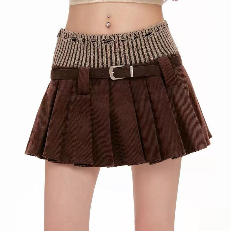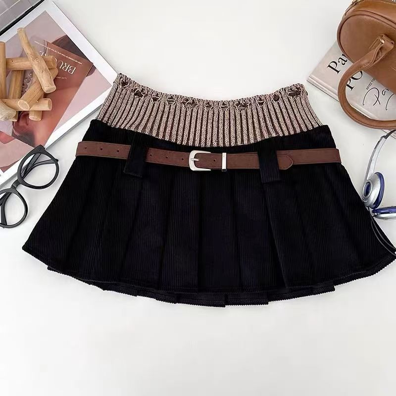 YF6660-(3色入内)时尚冬季小心机设计植绒提花针织拼接灯芯绒褶折A字迷你短裙