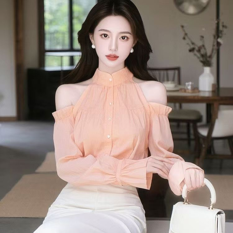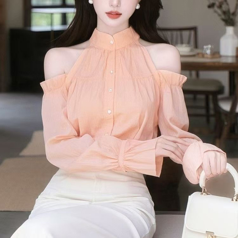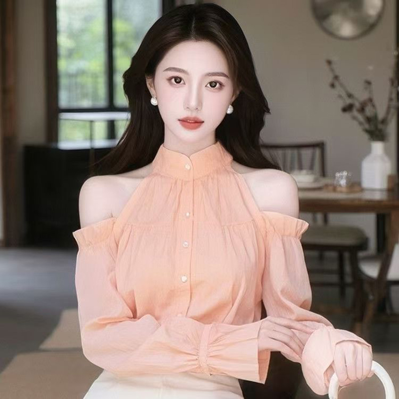 YF6663-图片色甜美时尚文艺风立领褶折系扣露肩长袖大码别致春秋百搭上衣