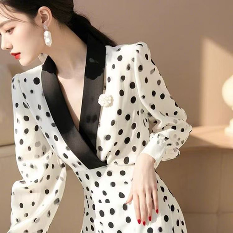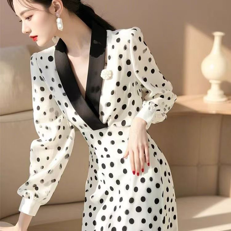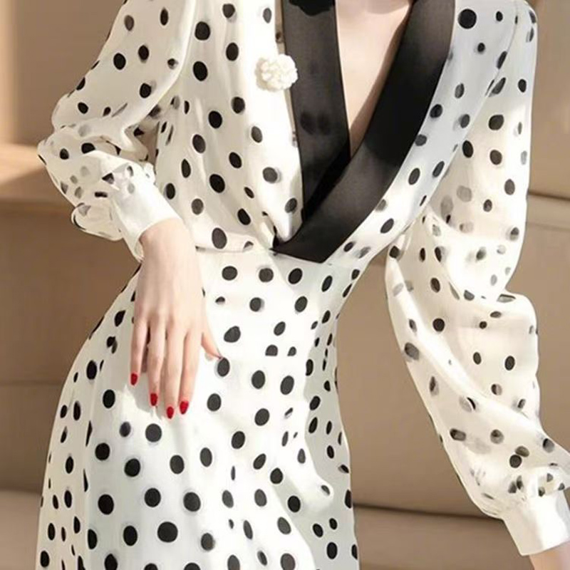 YF6664-图片色韩版撞色V领黑白波点设计收腰显瘦轻熟得体雪纺连衣裙