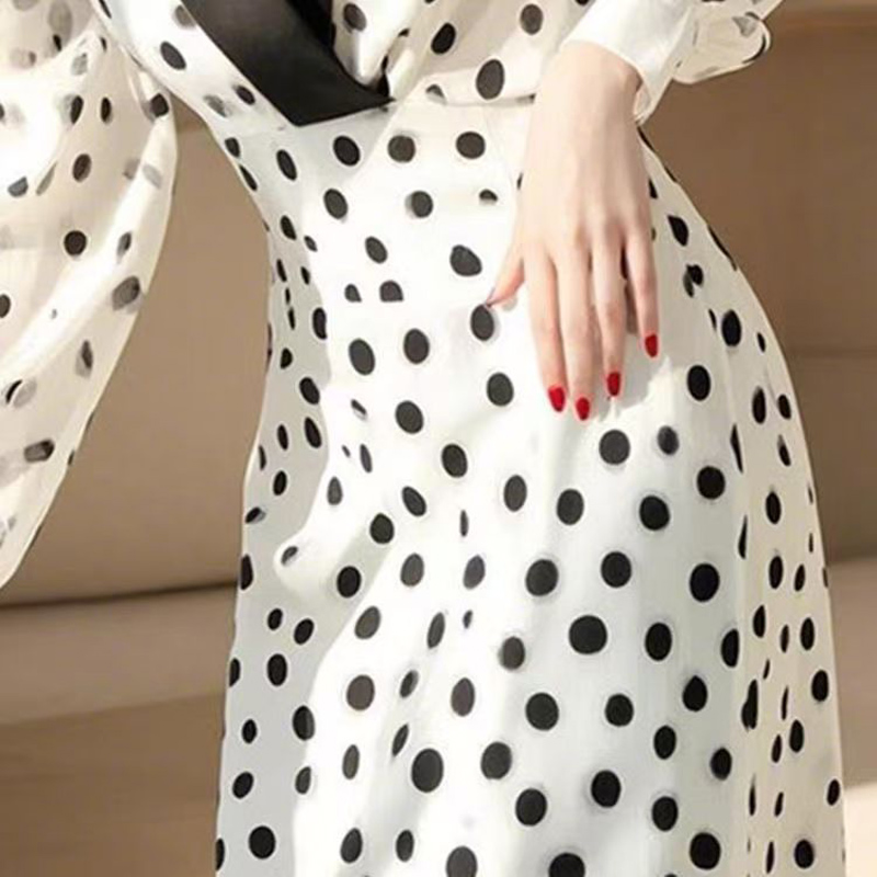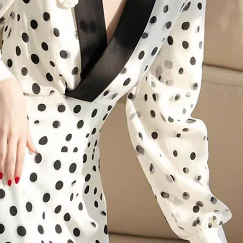 YF6664-图片色韩版撞色V领黑白波点设计收腰显瘦轻熟得体雪纺连衣