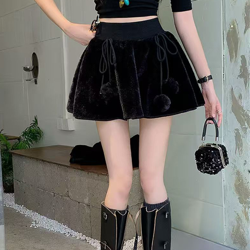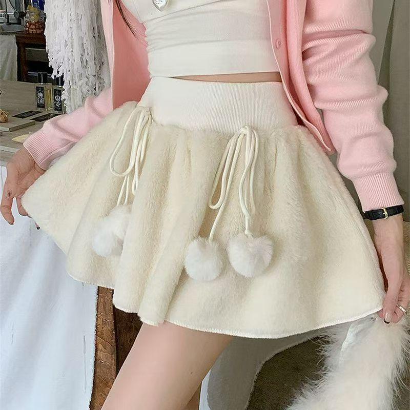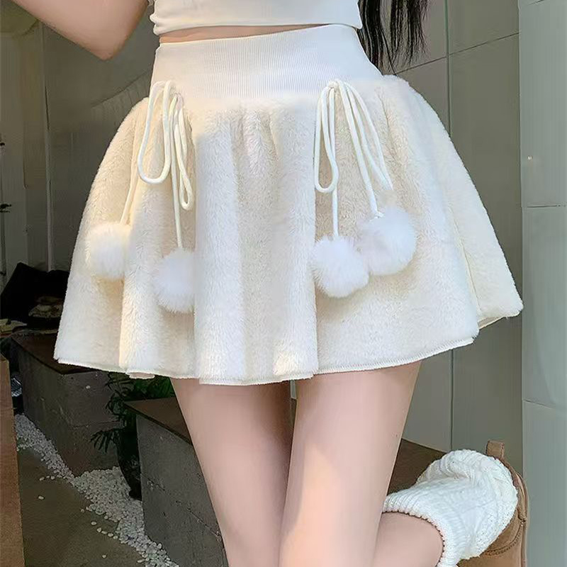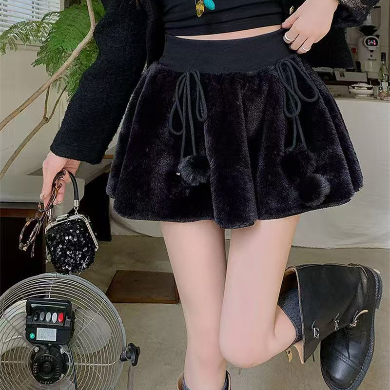 YF6683-(2色入内)小清新系绳毛毛球设计松紧腰A字防走光加厚毛毛绒冬季短裙