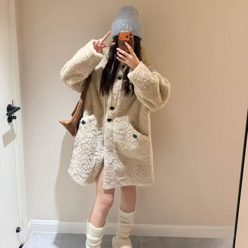 YF6691-图片色甜美时尚韩版长袖边帽系扣落肩设计软糯羊羔绒保暖中长工款外套