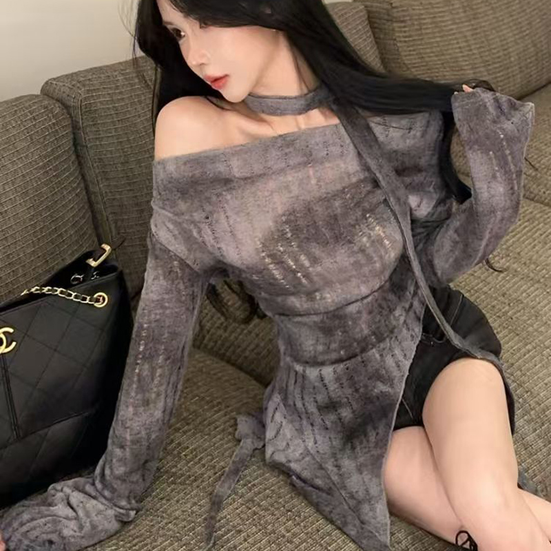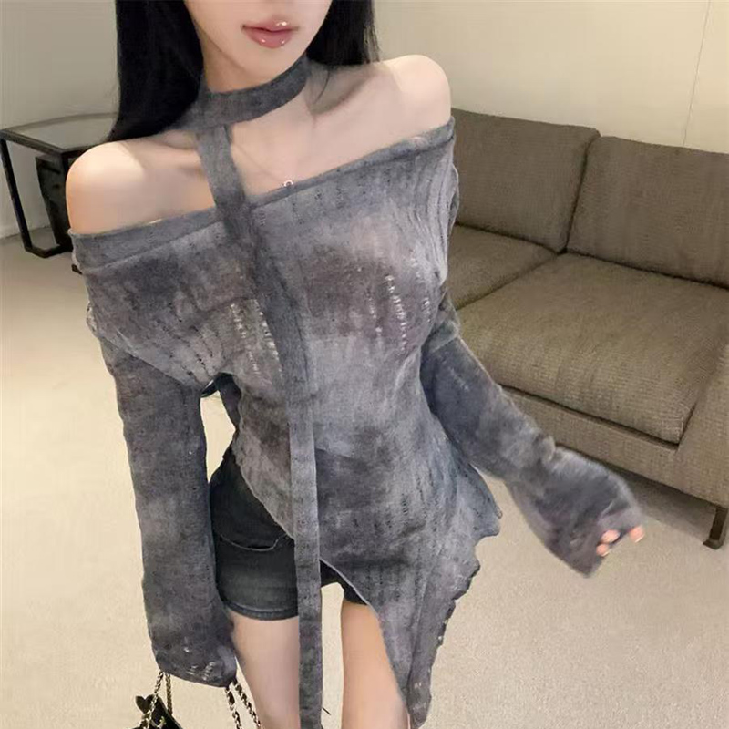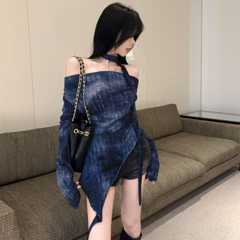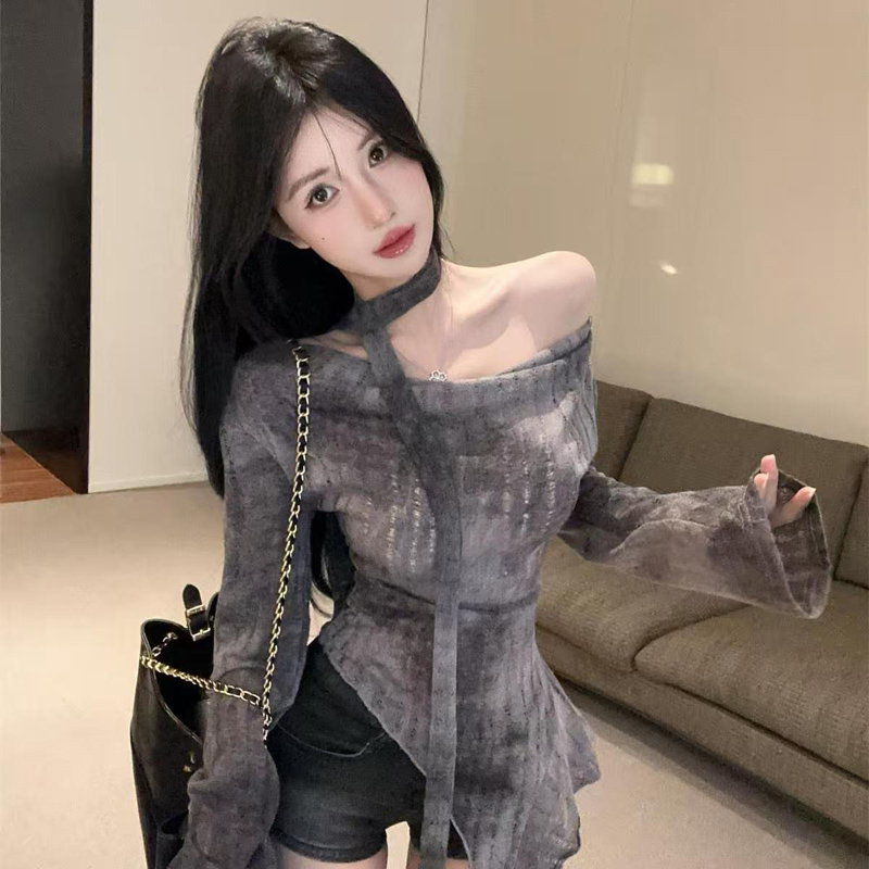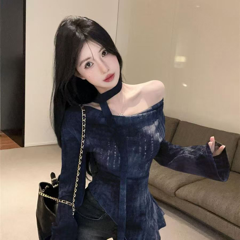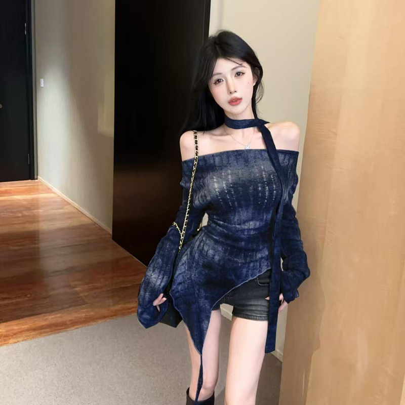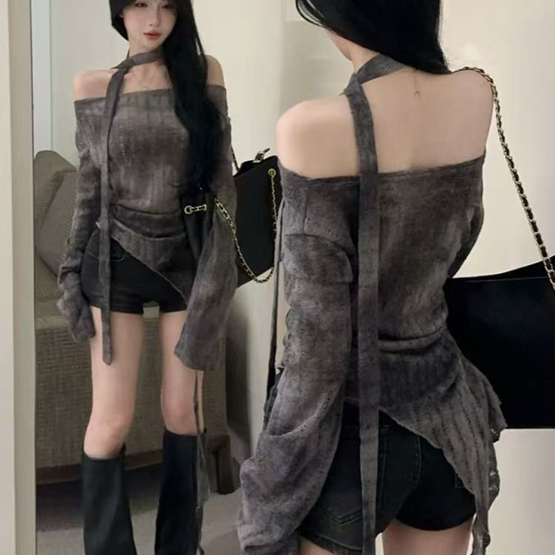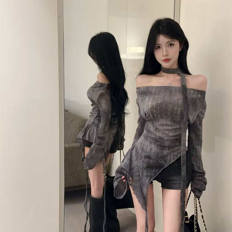 YF6692-(2色入内)性感辣妹潮流一字肩飘带设计不规则收腰时尚打底上衣