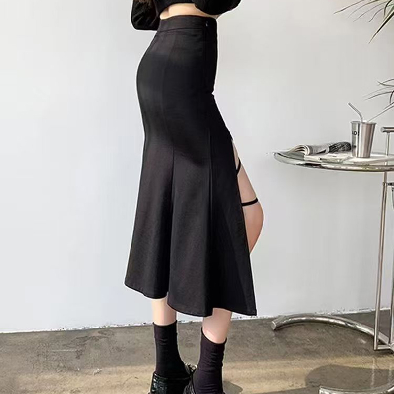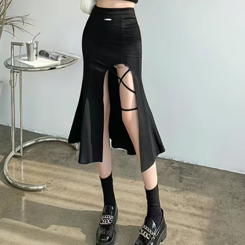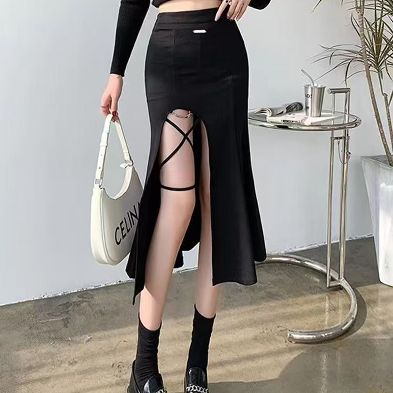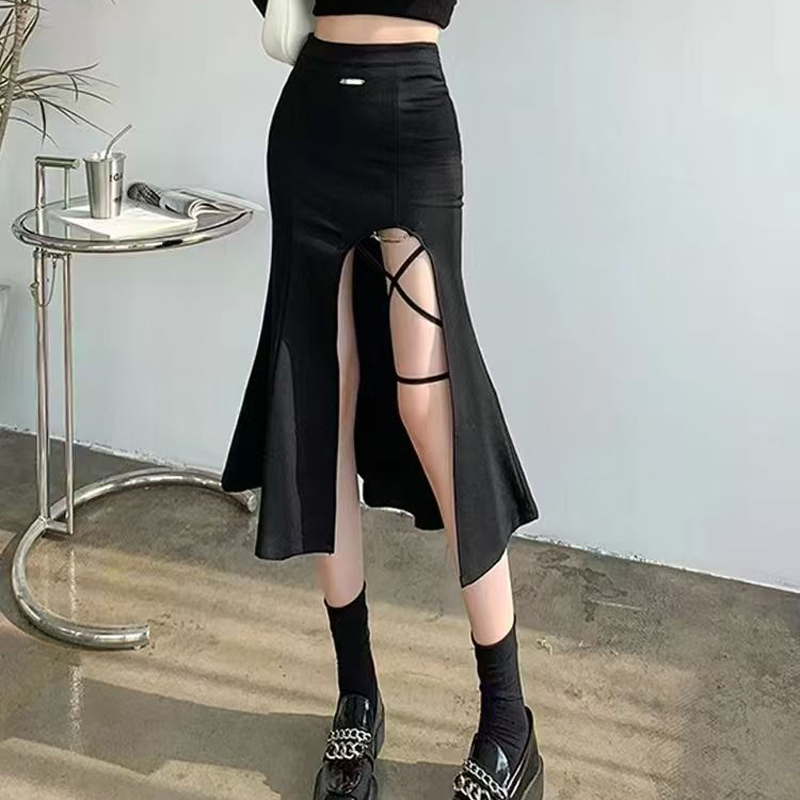 YF6693-图片色韩版小心机开叉链条交叉绑带拼接鱼尾纯欲风荷叶边百搭鱼尾裙