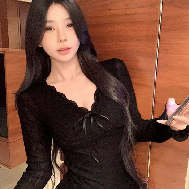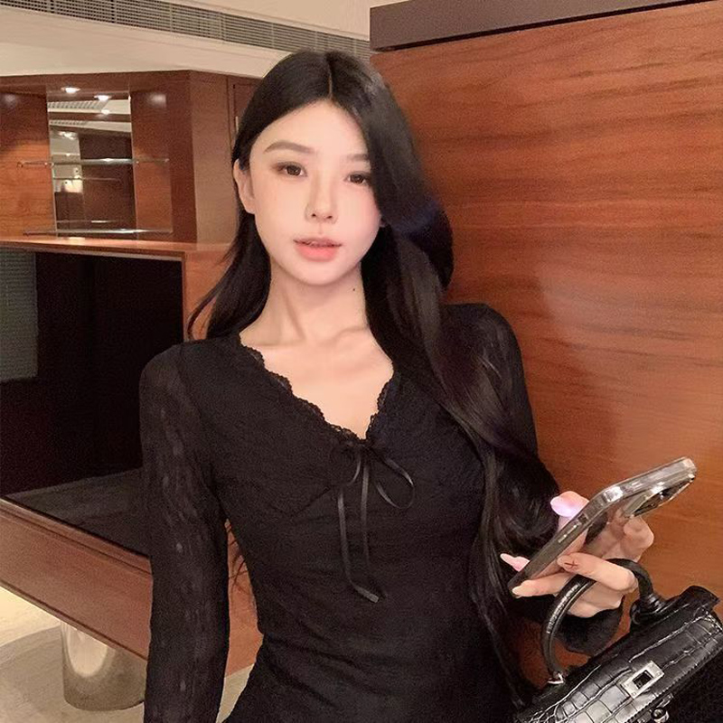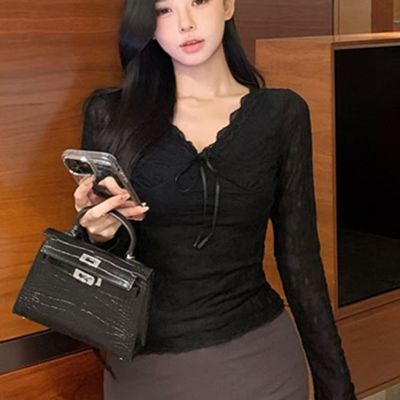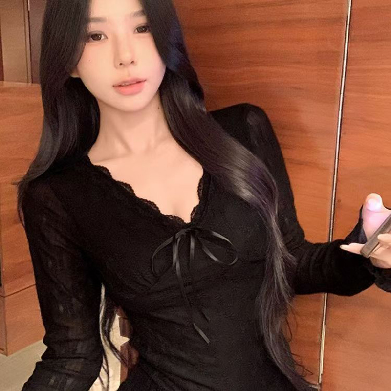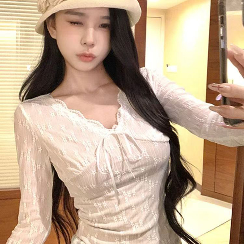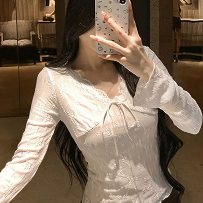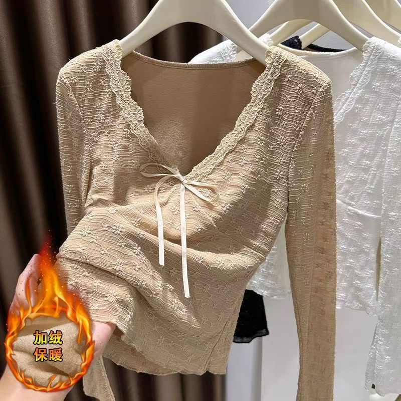 YF6696-(4色入内)温柔风提花蕾丝系蝴蝶结加绒保暖长袖花边V领打底上衣