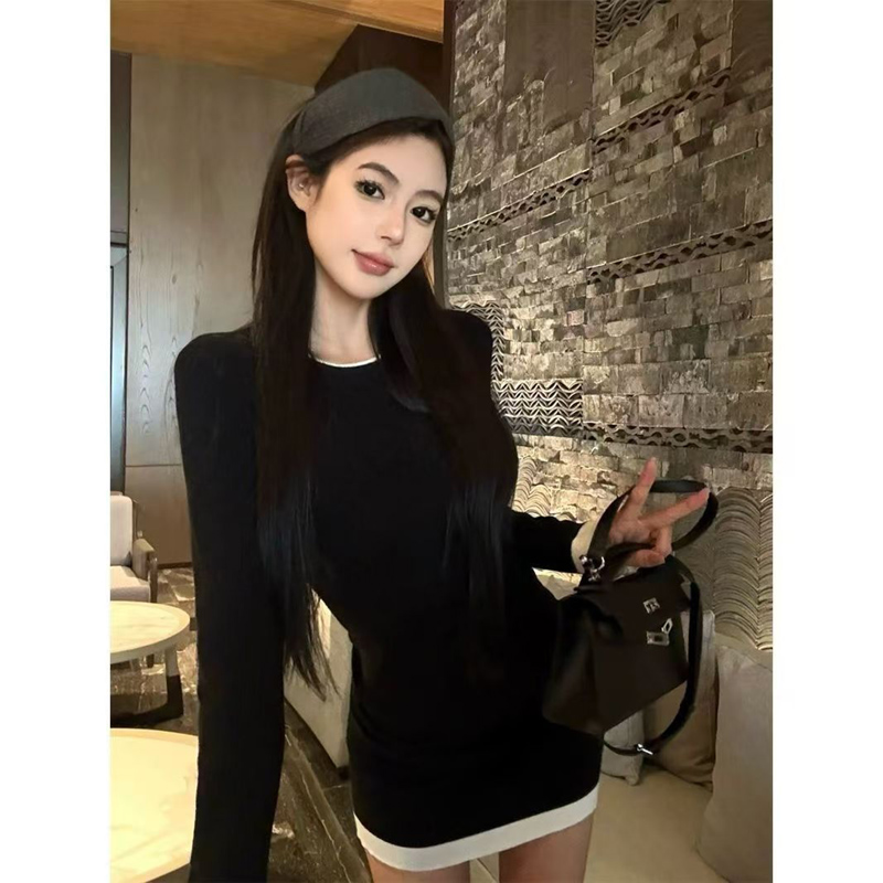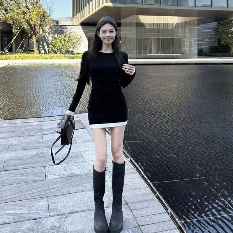 YF6698-(2色入内)港式假两件圆领长袖弹力修腰包臀二色设计德绒保暖秋冬打底裙