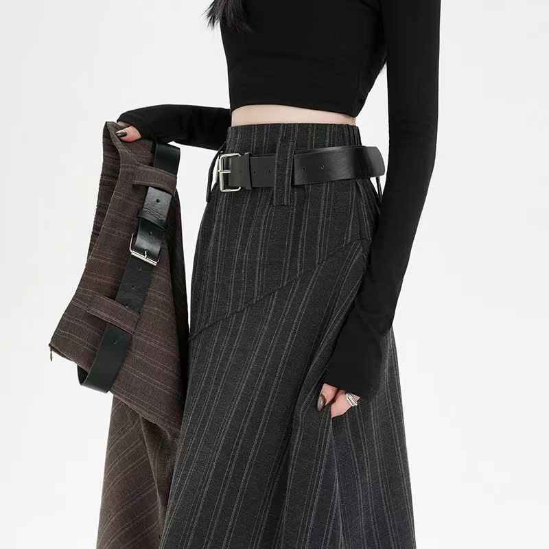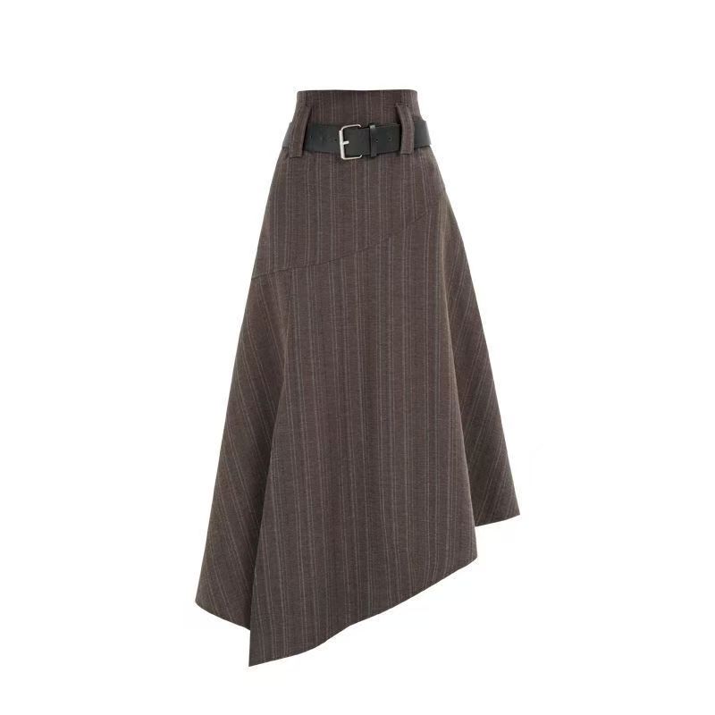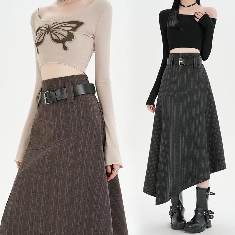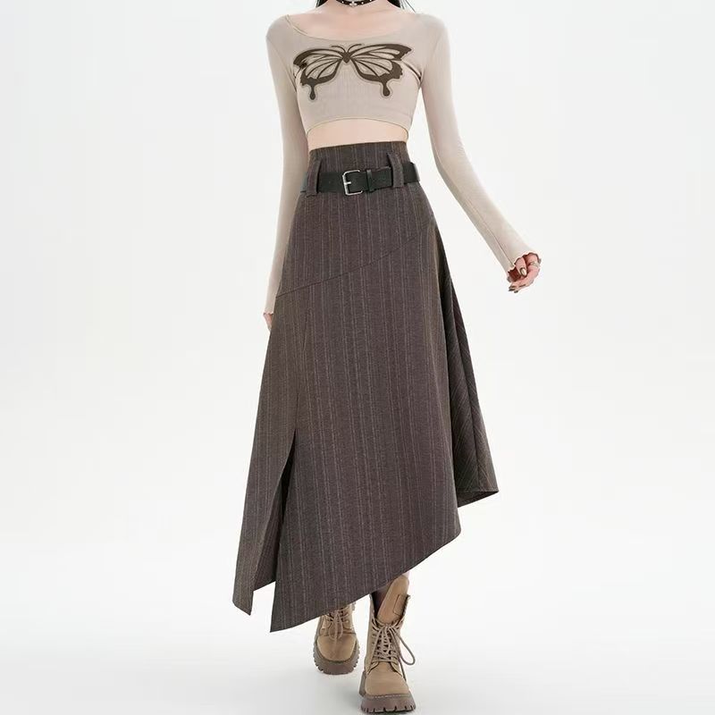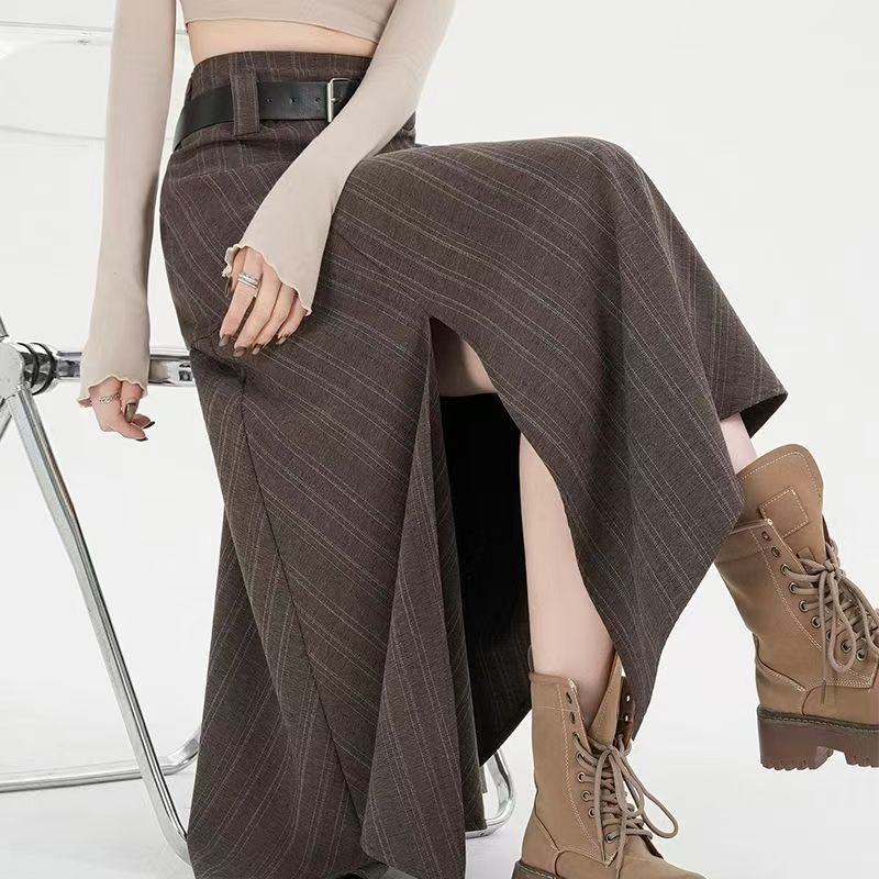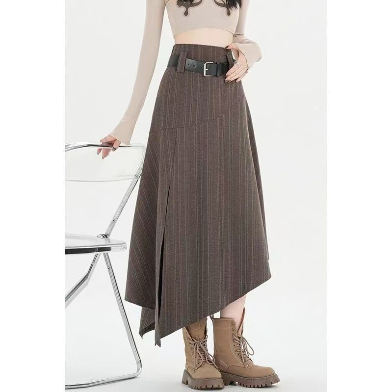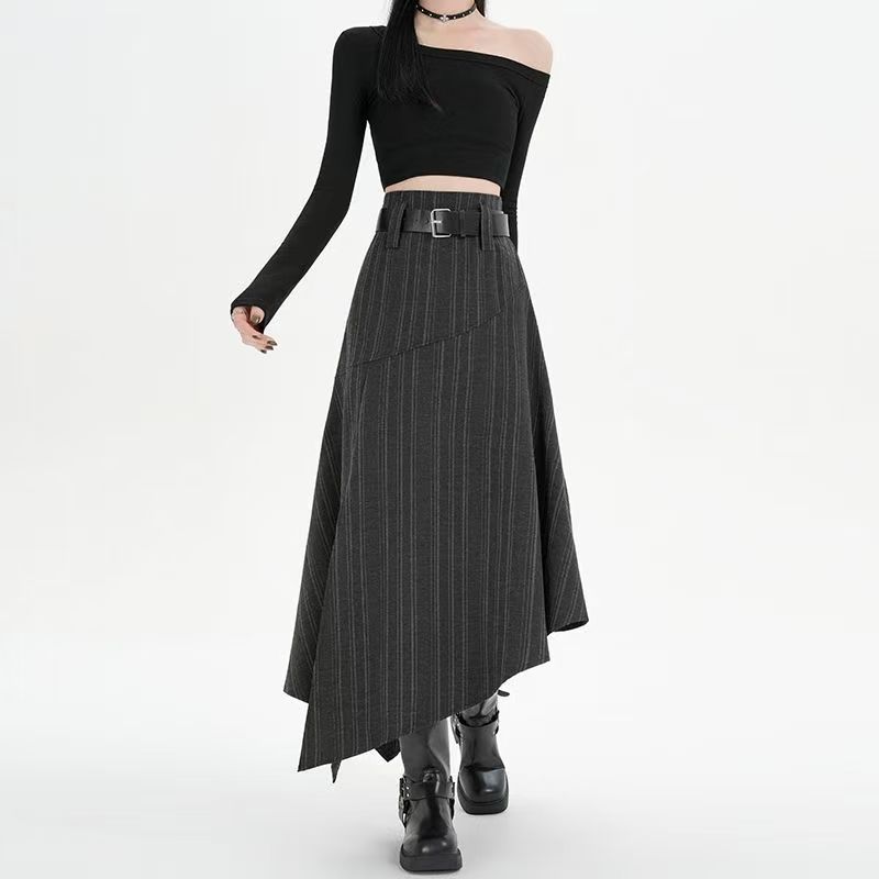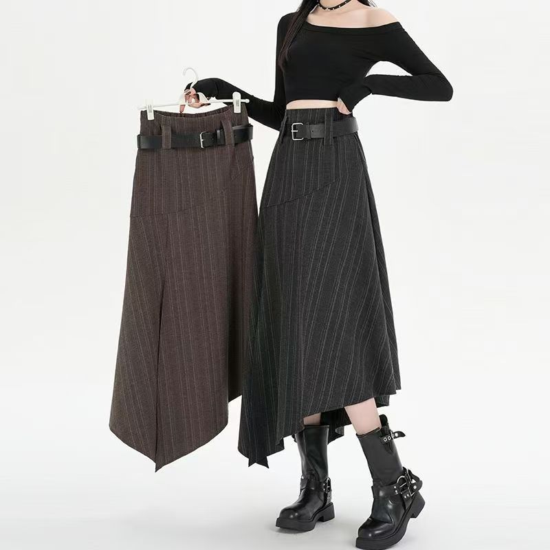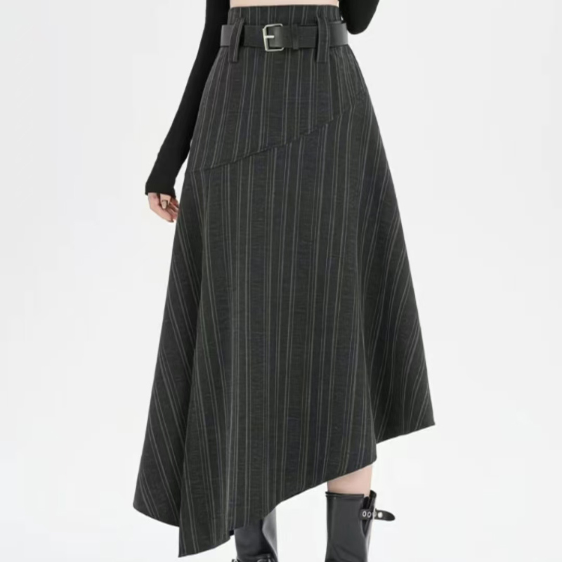 YF6699-(2色入内)高级感不规则下摆暗条纹拼接开叉中长款复古气质半身裙