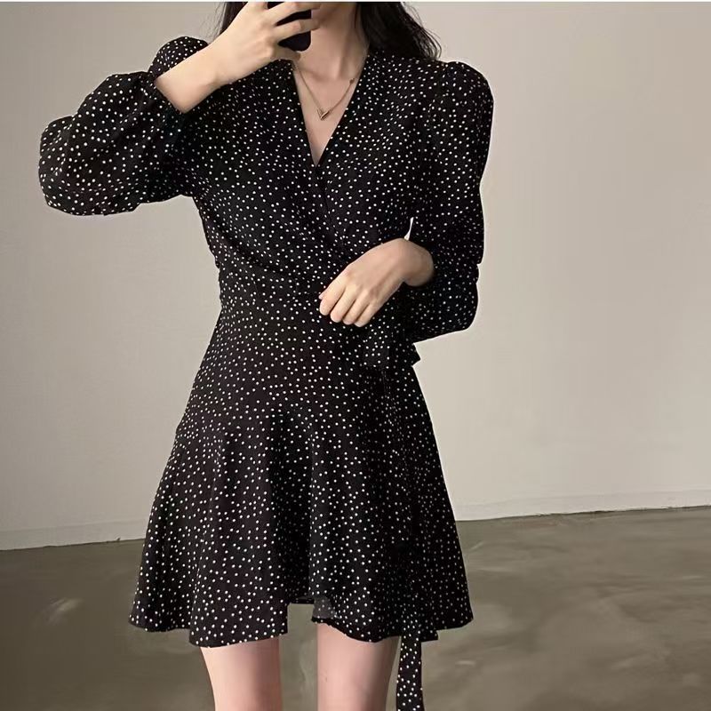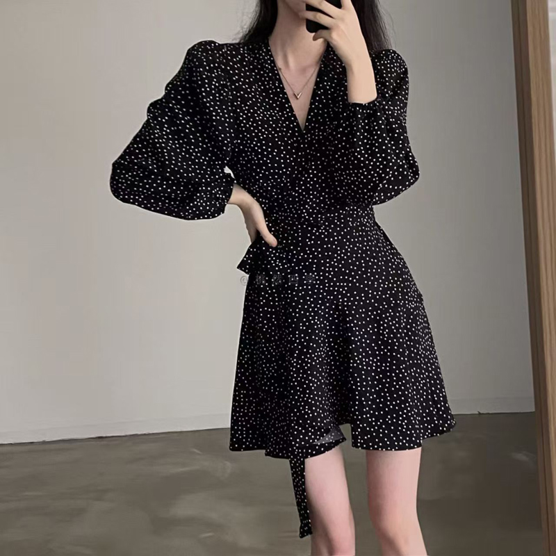 YF6706-图片色韩版小可爱迷人波点泡泡袖侧绑绳收腰小众设计赫本风连衣