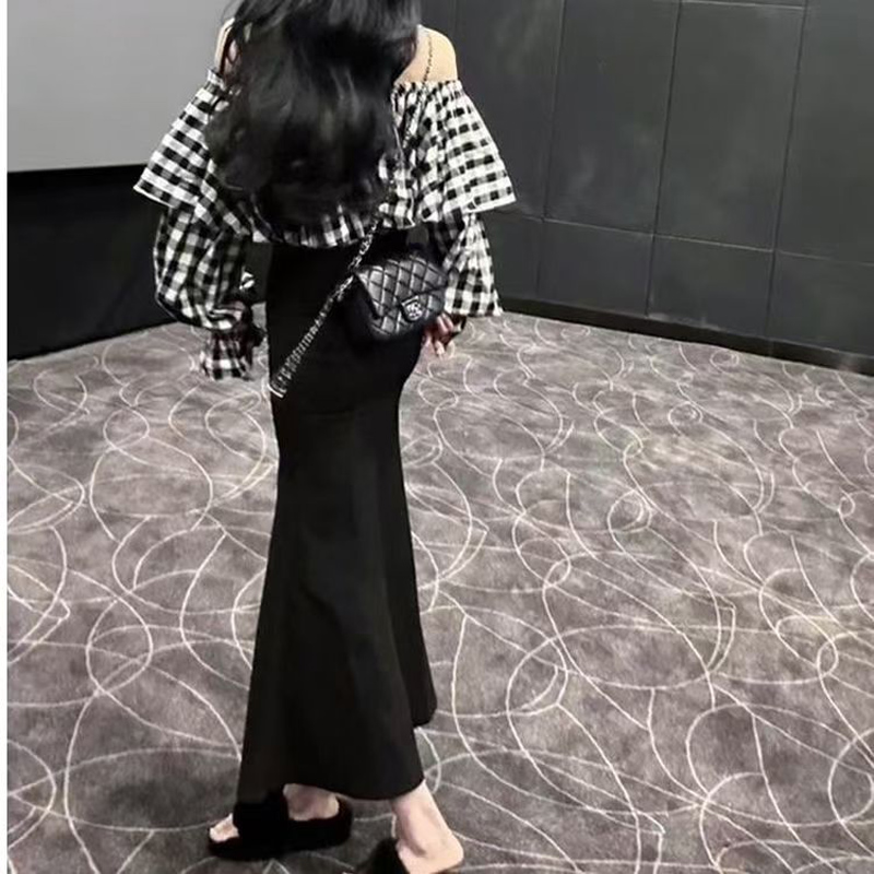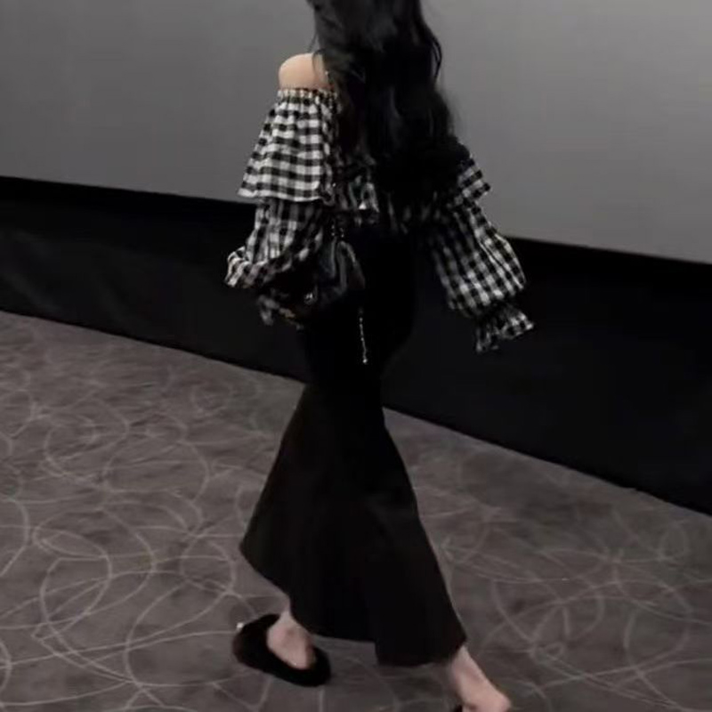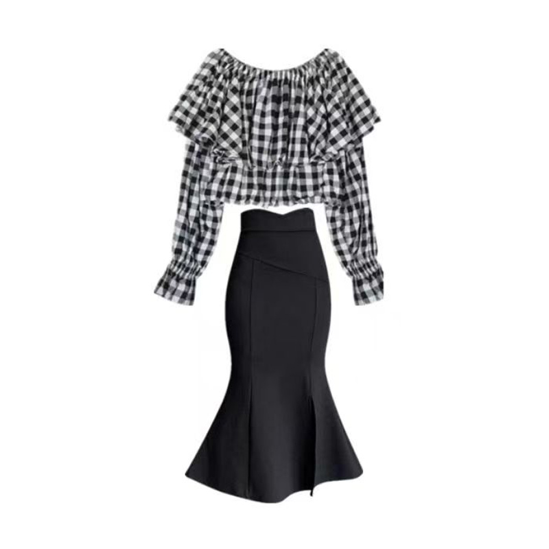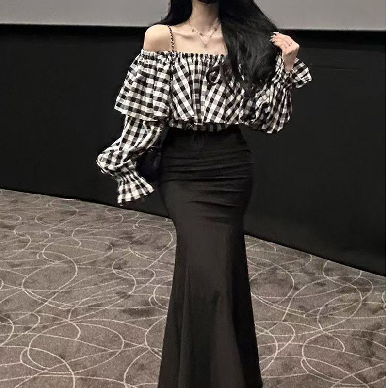 YF6711-图片色韩版小香风一字肩木耳袖松紧荷叶边设计复古格子短装休闲上衣
