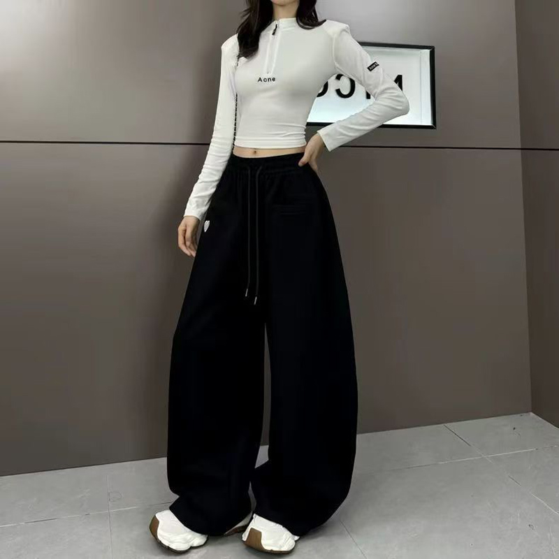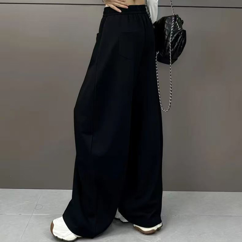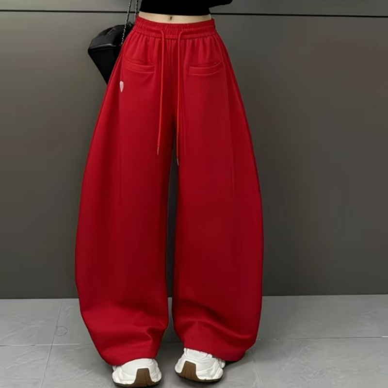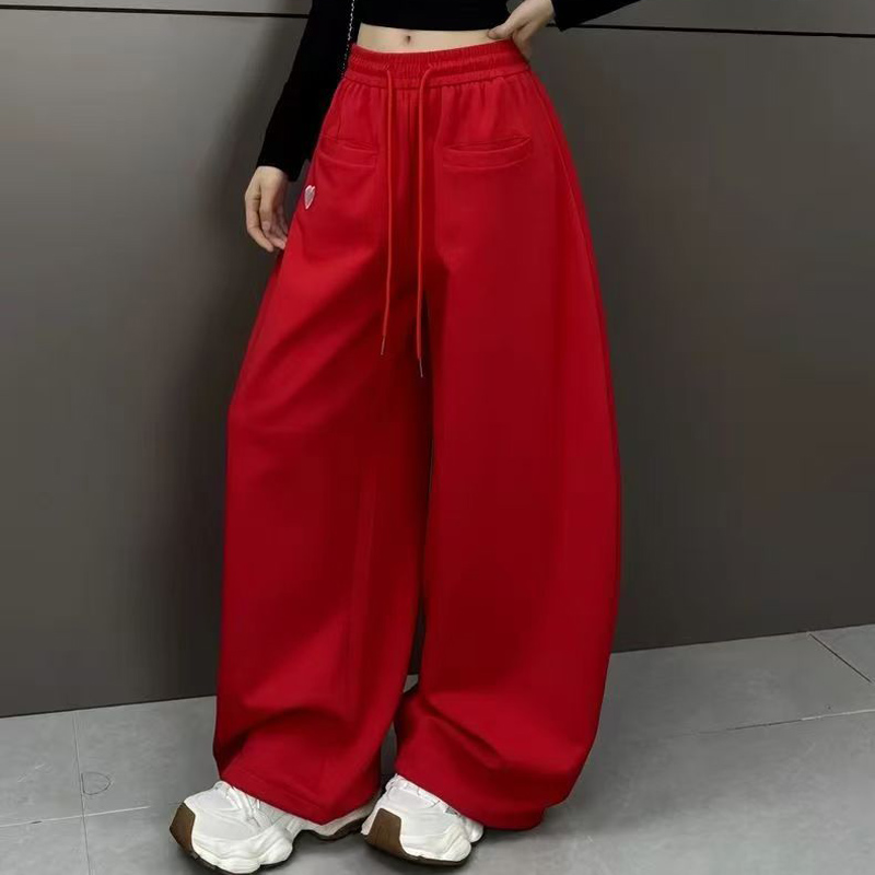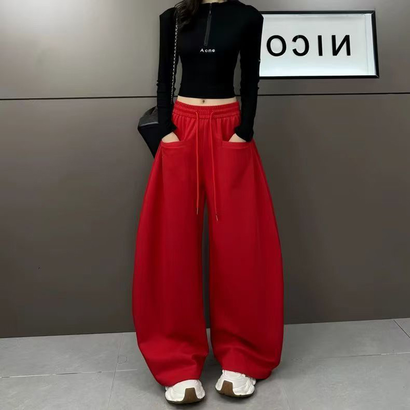 YF6713-(2色入内)港式弯刀直插口袋松紧腰绑绳阔腿运动休闲红色卫衣裤