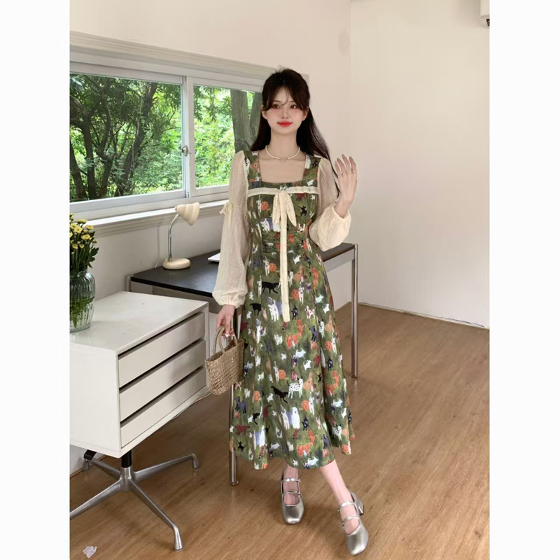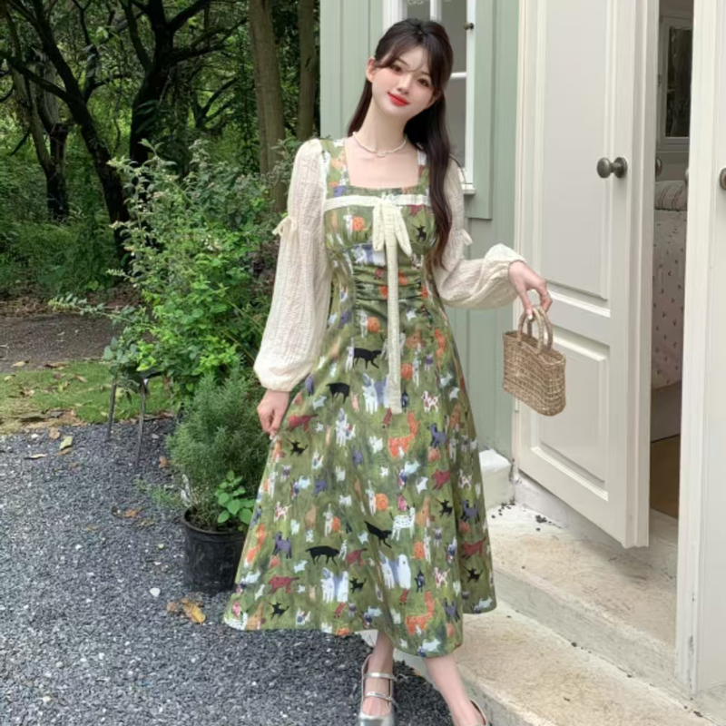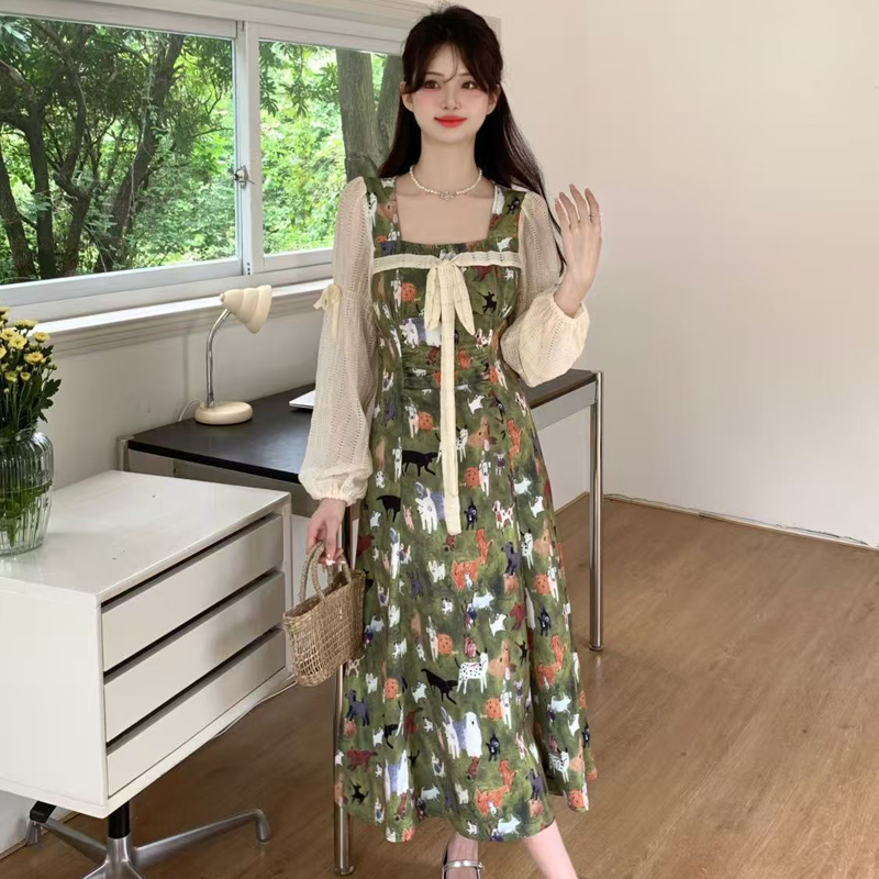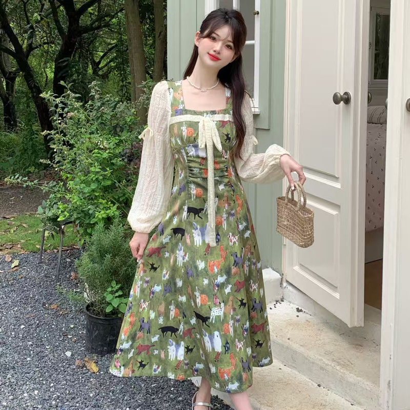 YF6717-图片色甜美时尚小清新灯笼袖方领系蝴蝶结油田印花复古雪纺连衣裙