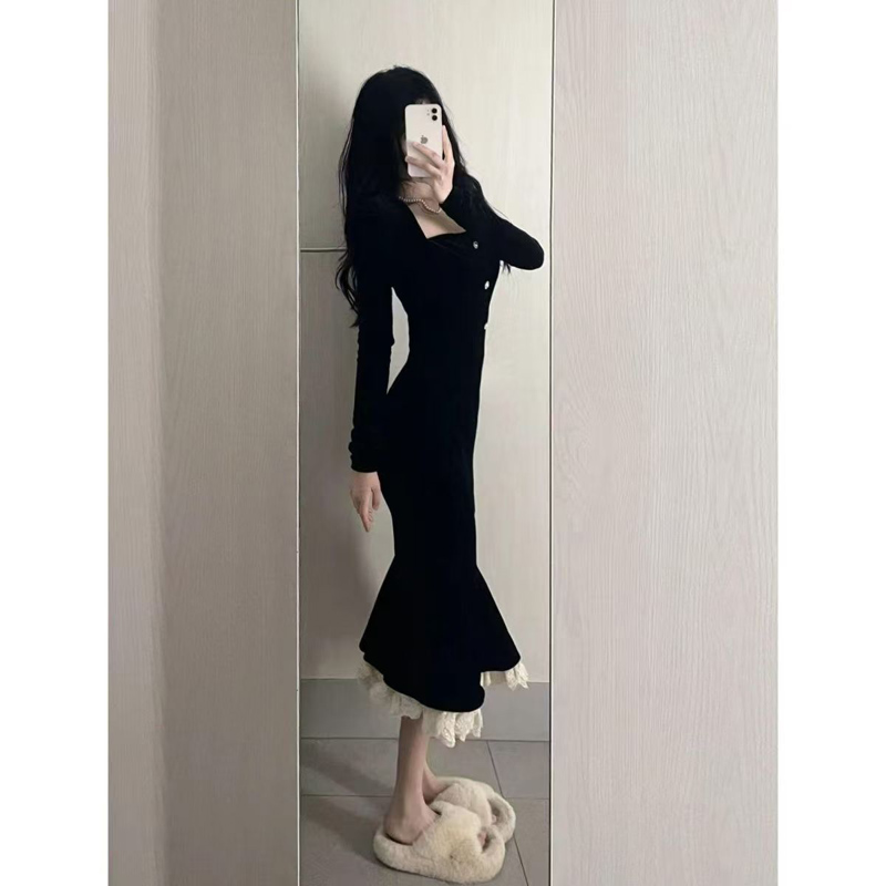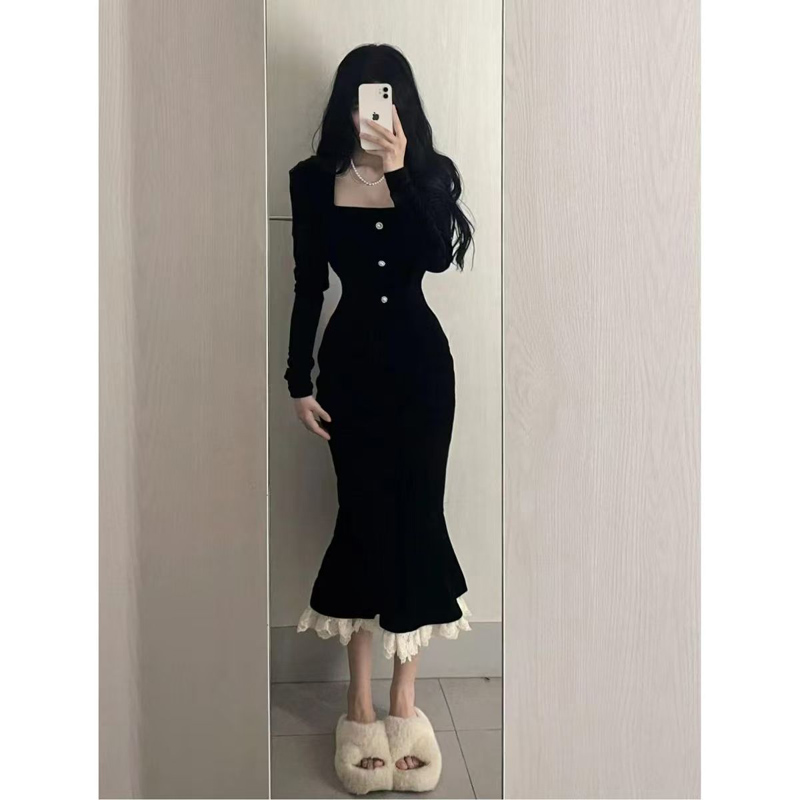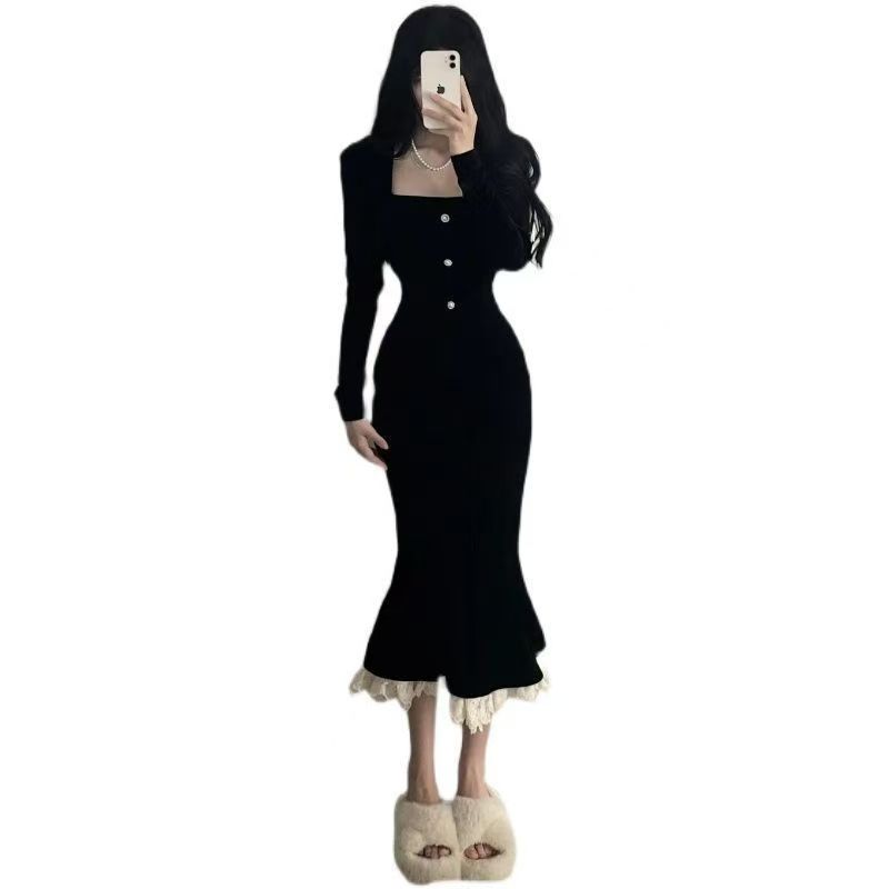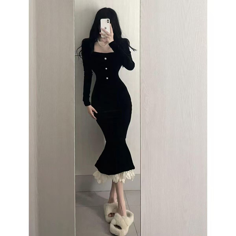 YF6720-图片色辣妹新款冬季方领排扣修腰包臀蕾丝拼接洋气瓶型设计丝绒礼服