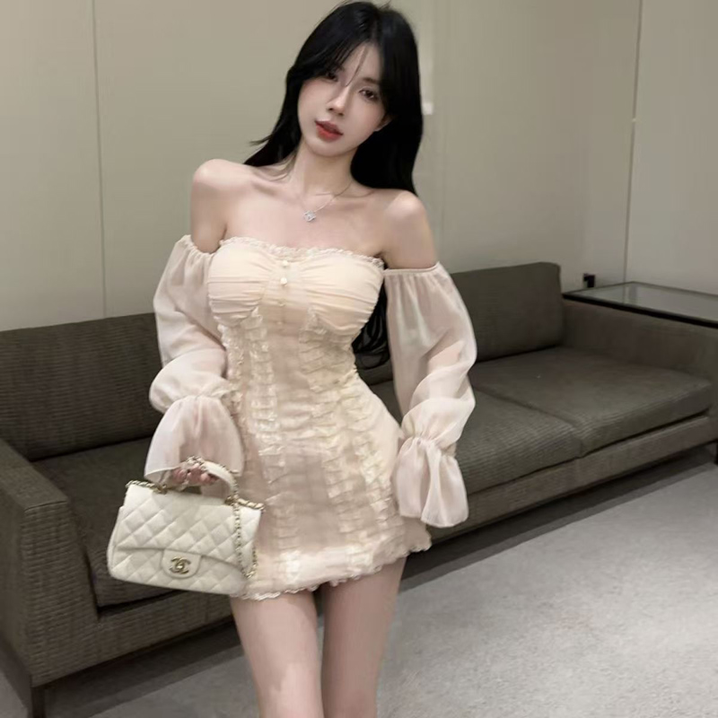 YF6721-图片色性感辣妹一字肩泡泡袖花边裹胸提花波纹设计低胸蕾丝礼服裙