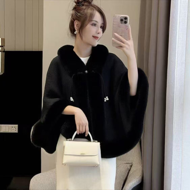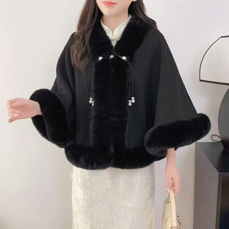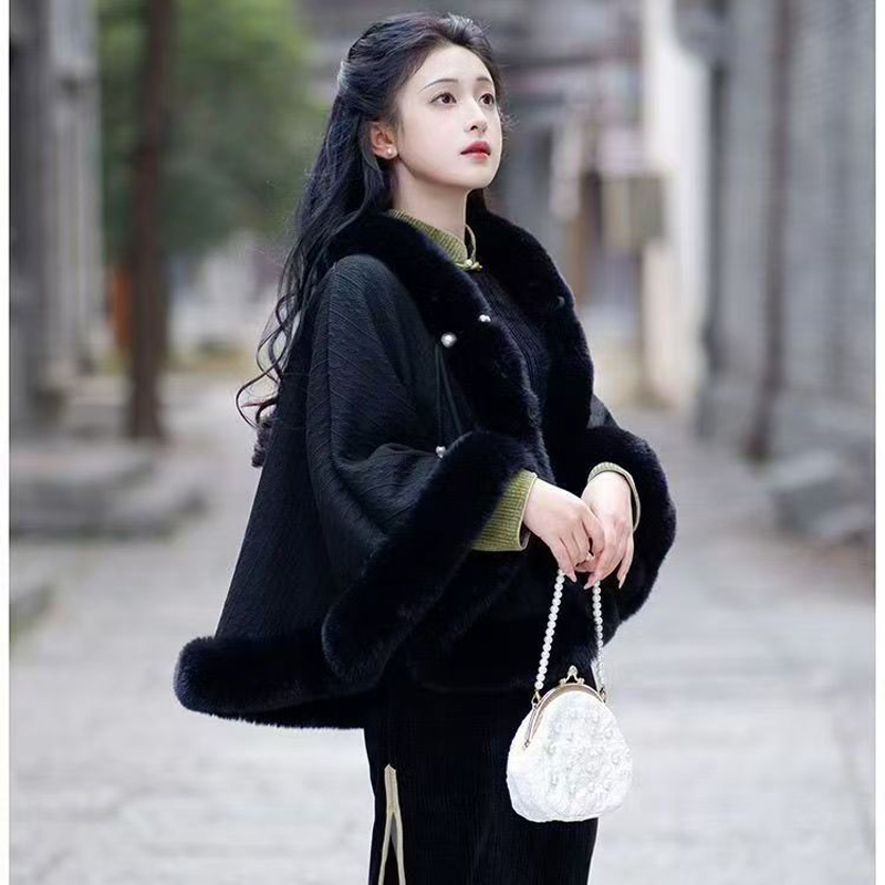 YF6723-(2色入内)名媛气质毛毛领珍珠扣长袖单排扣设计加绒加厚披肩斗篷