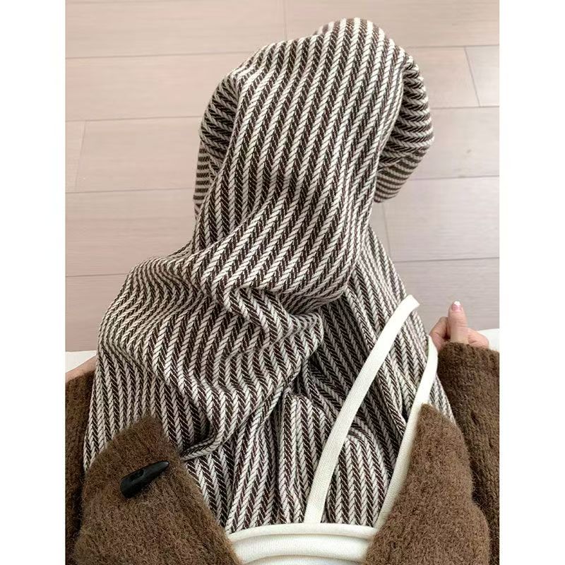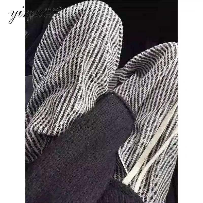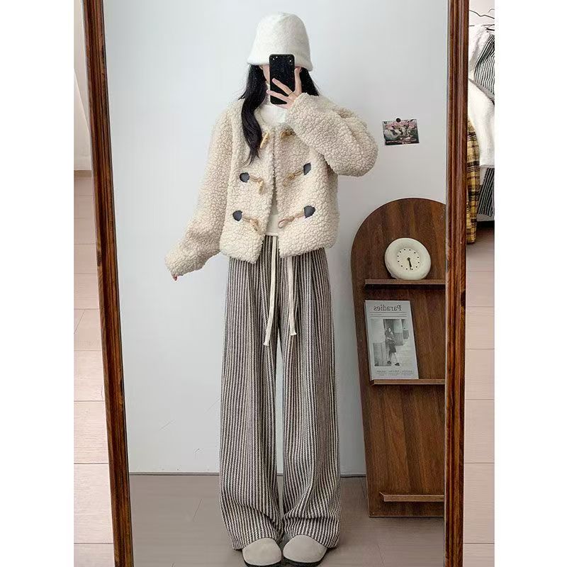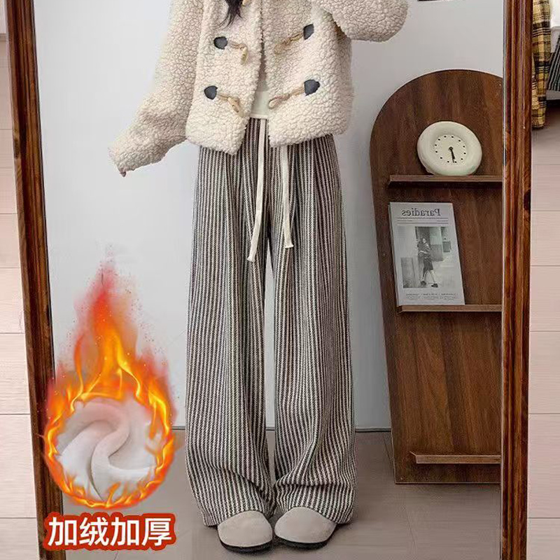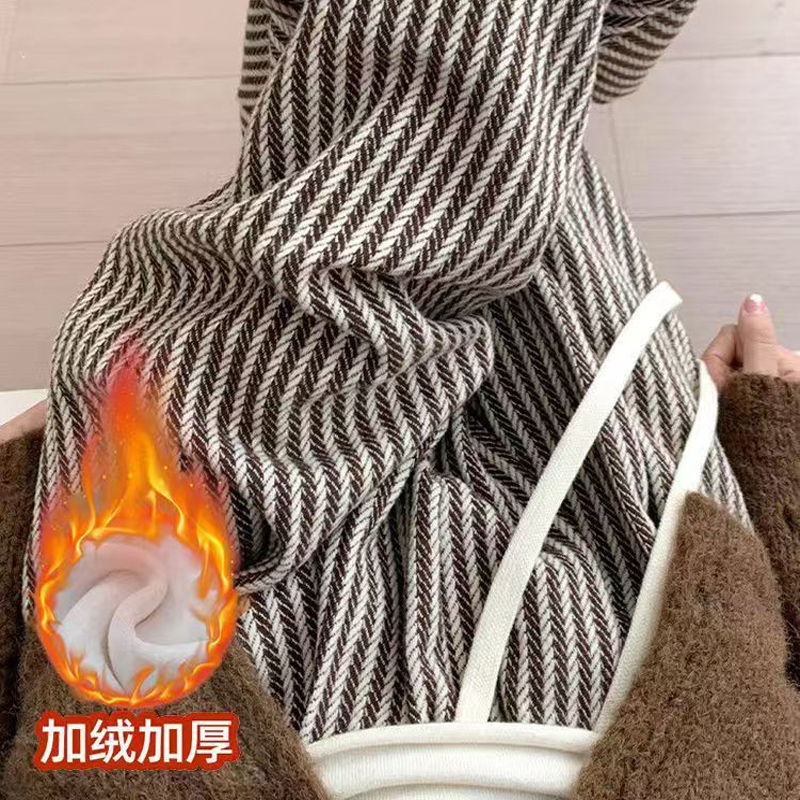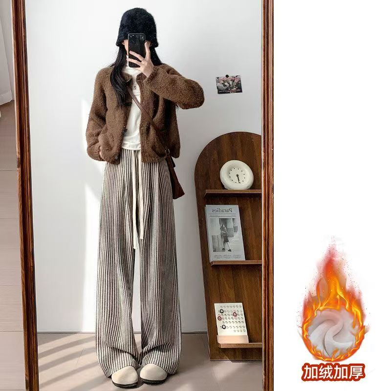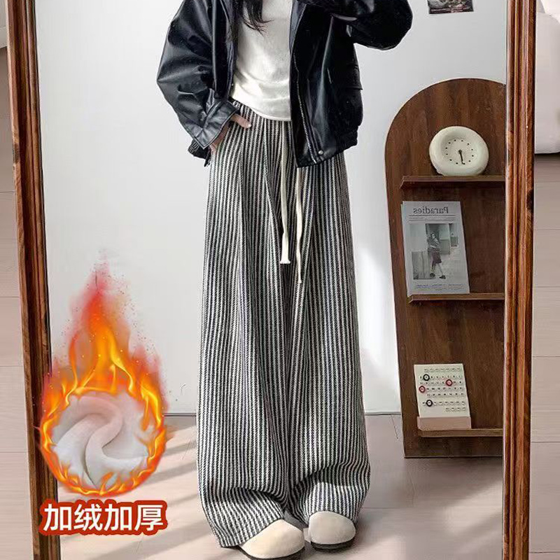 YF6724-(2色入内)秋冬加绒松紧腰抽绳直筒坠地感撞色条纹慵懒风休闲毛呢裤