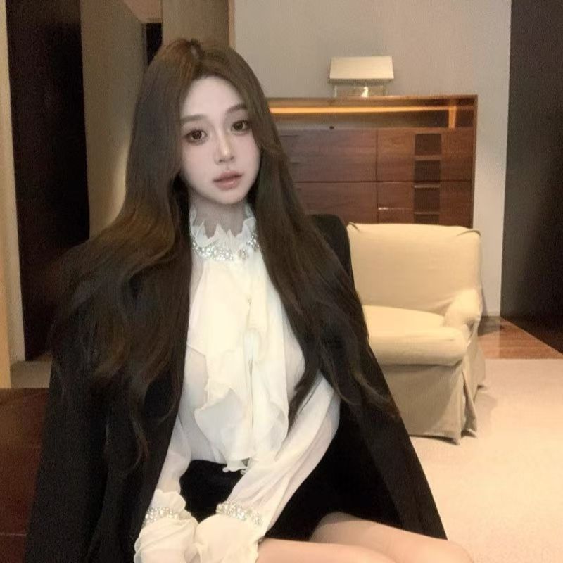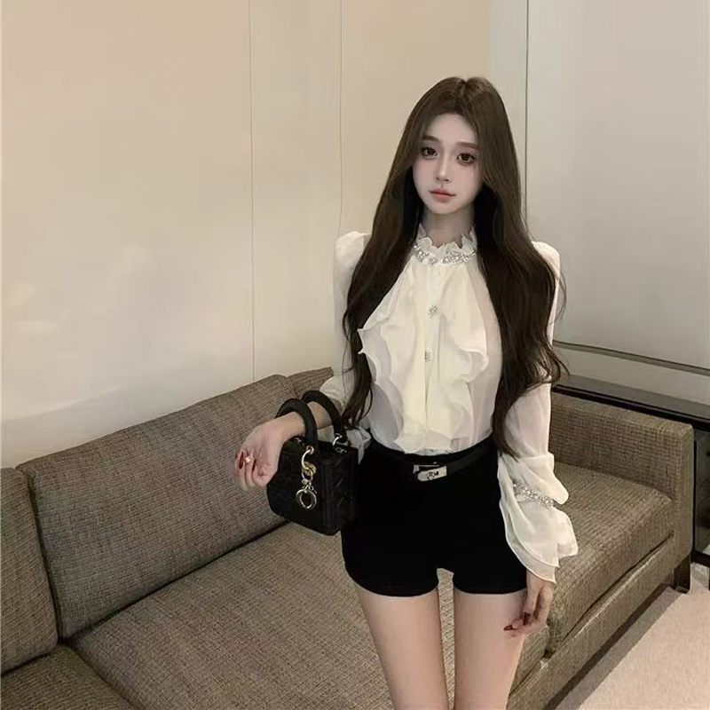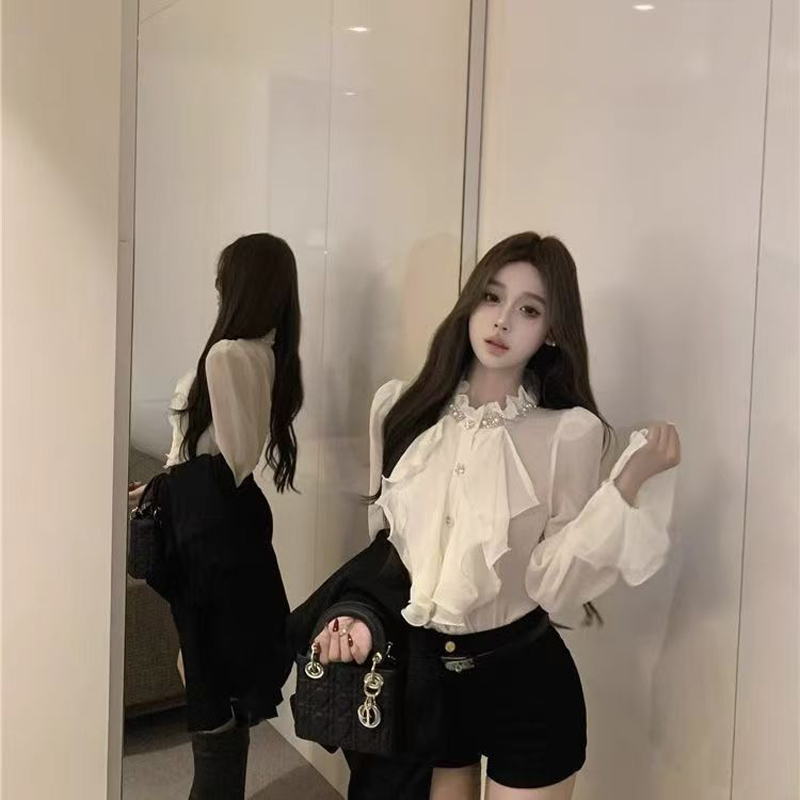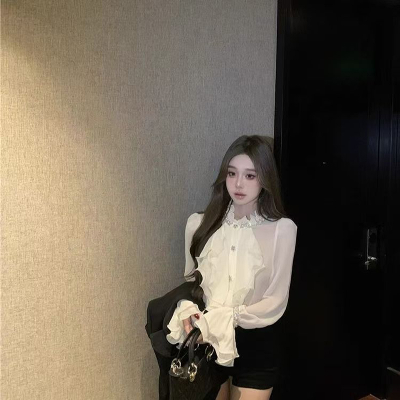 YF6725-图片色甜美时尚OL通勤灯笼袖花边领钉珠荷叶边修身显瘦雪纺上衣