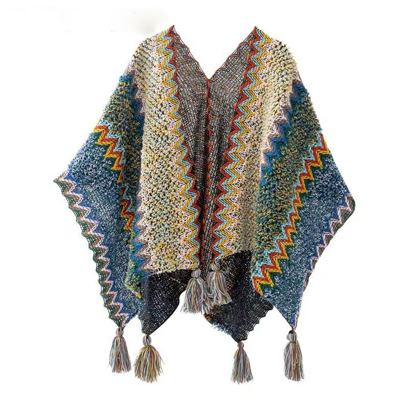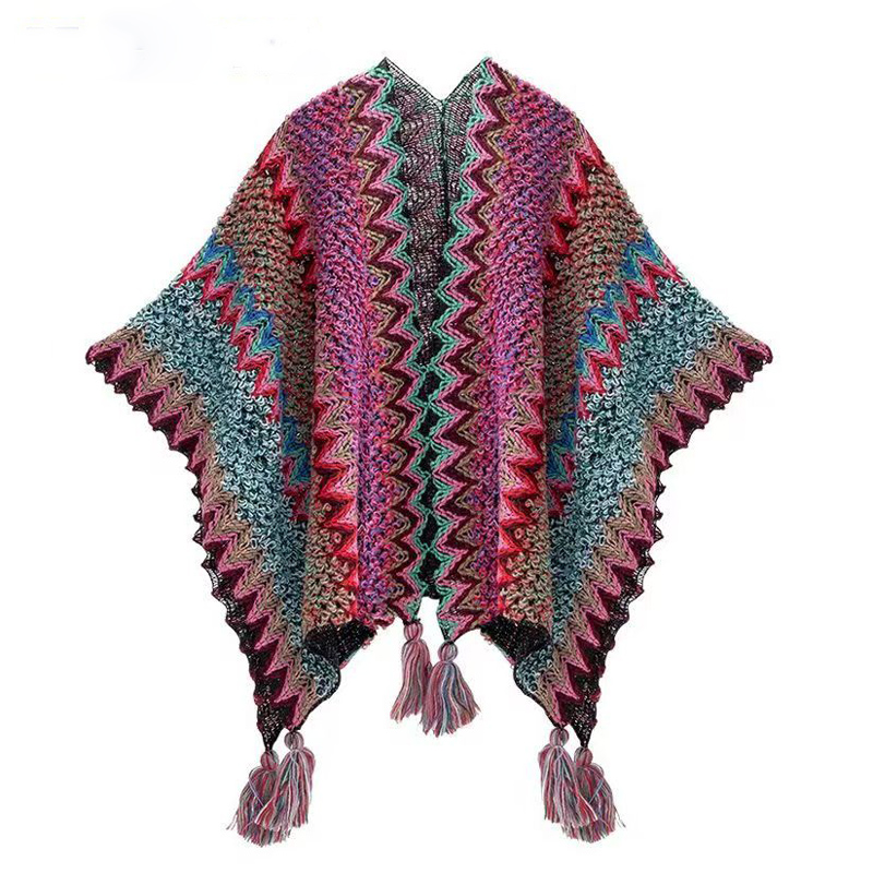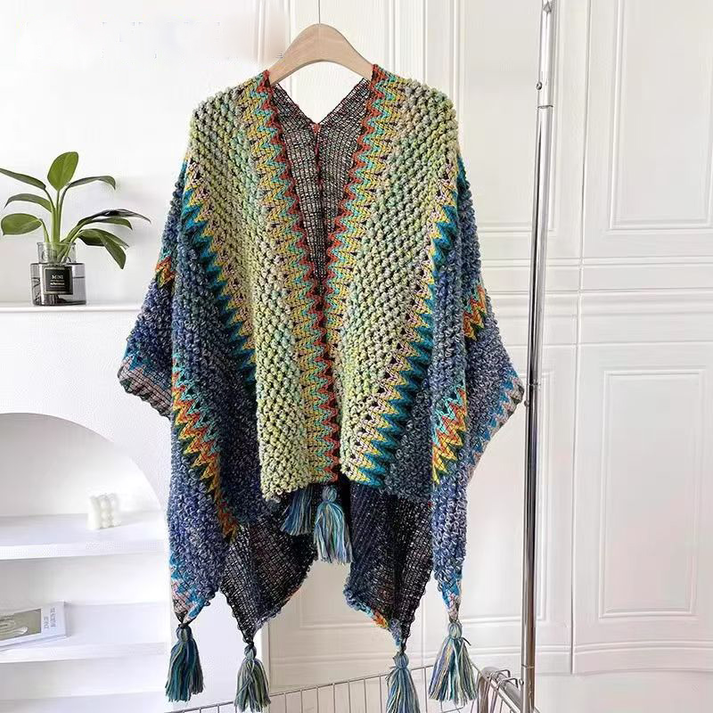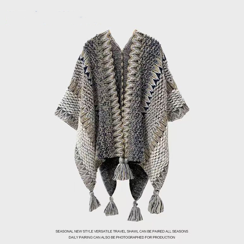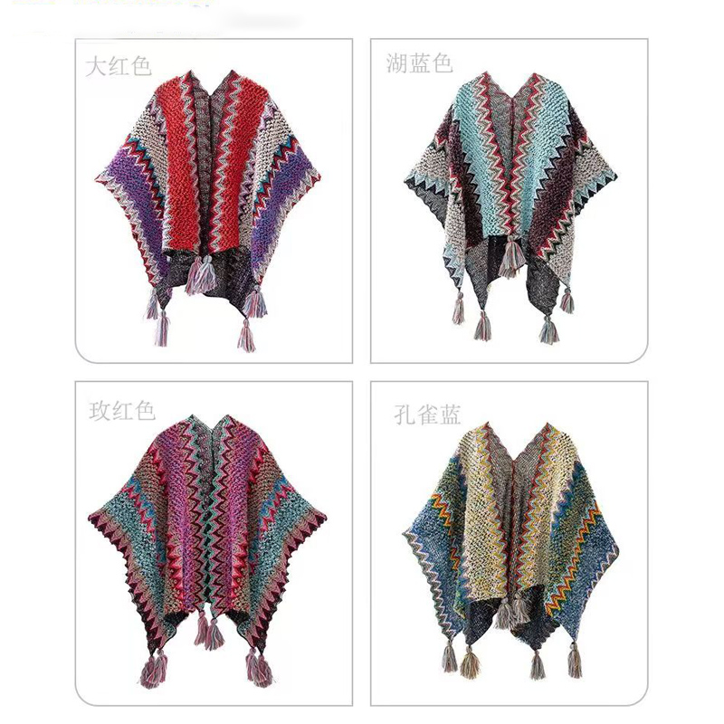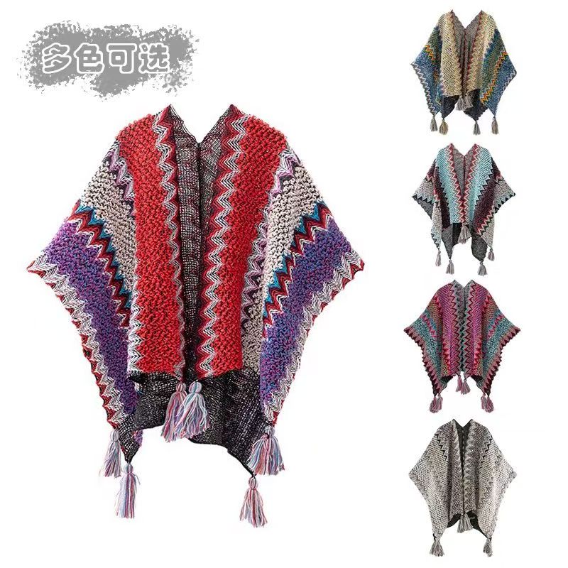 YF6840-(5色入内)民族风提花撞色编织提花设计流苏民族风加绒针织披肩斗篷