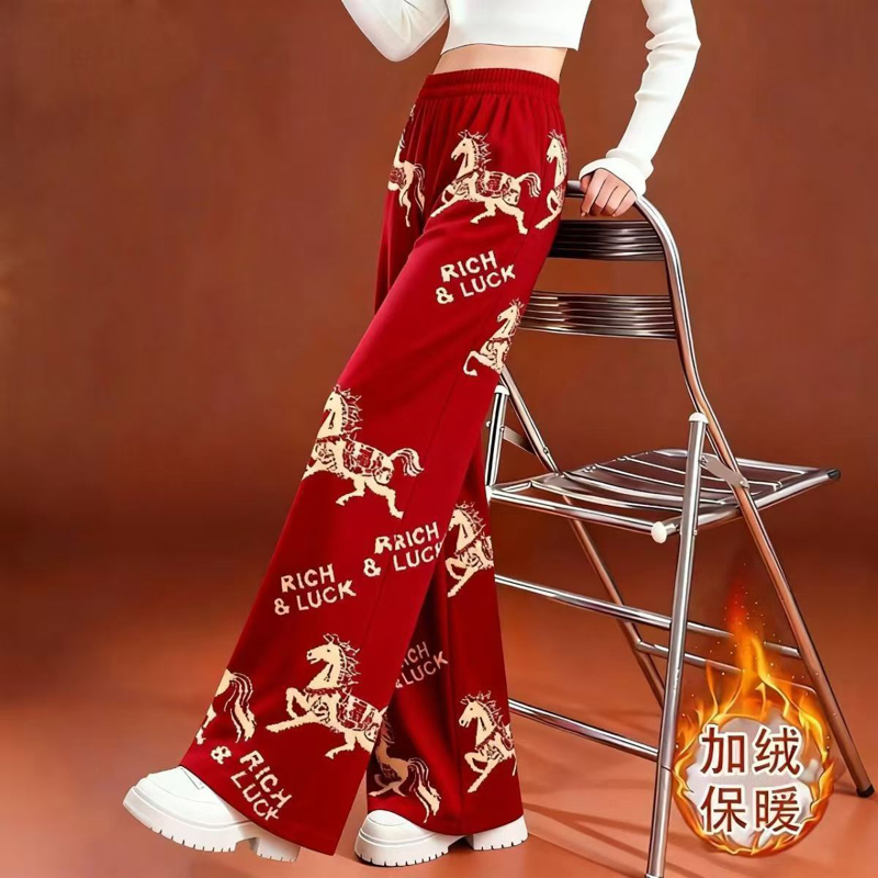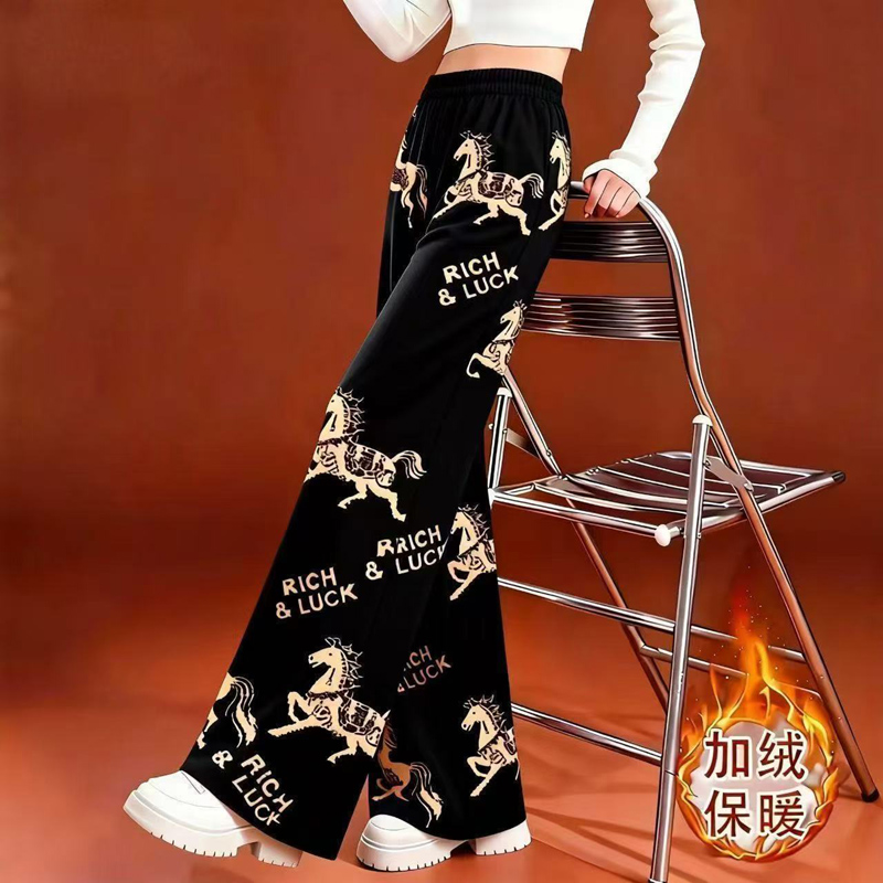 YF6843-(3色入内)2026马年冬季加绒时尚印花松紧腰直筒坠地感休闲卫衣裤