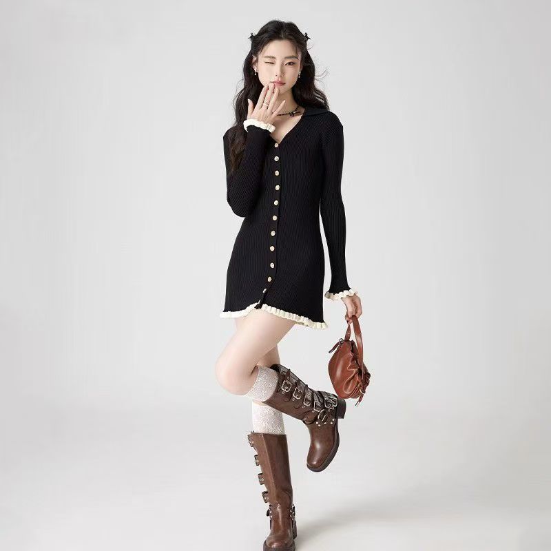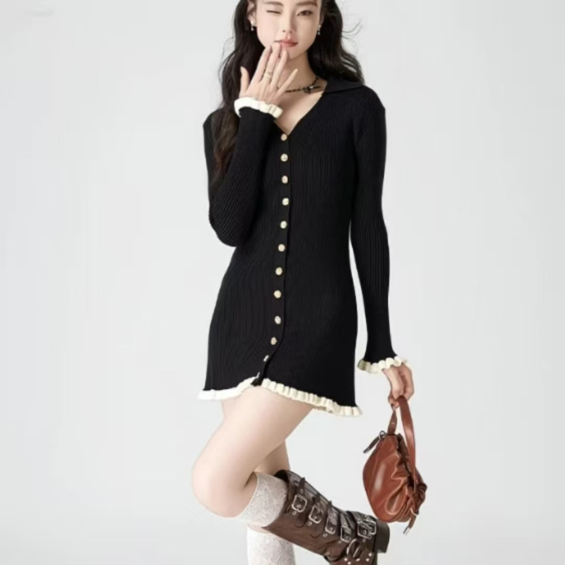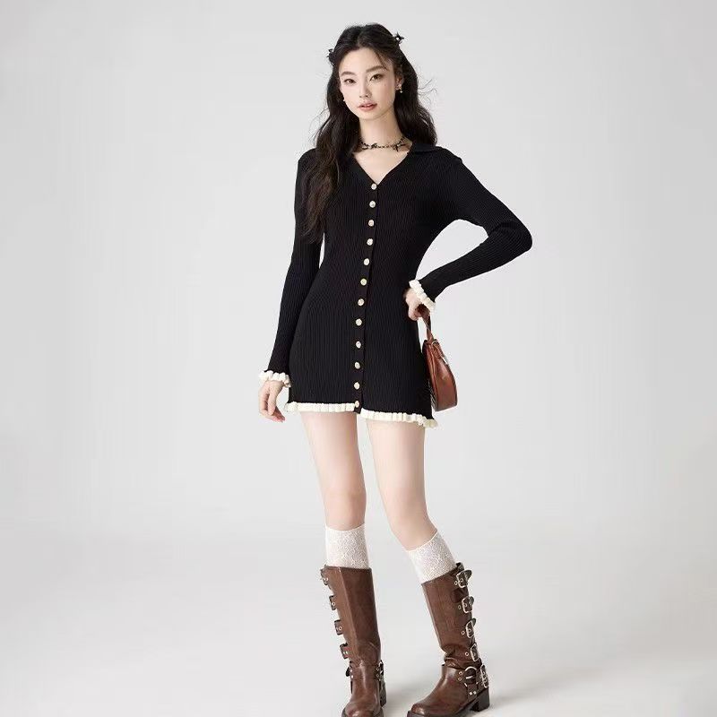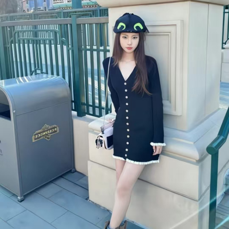 YF6846-图片色韩版冬季黑白拼色设计长袖V领排扣弹力修腰显瘦针织裙