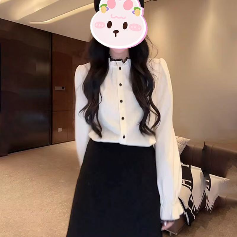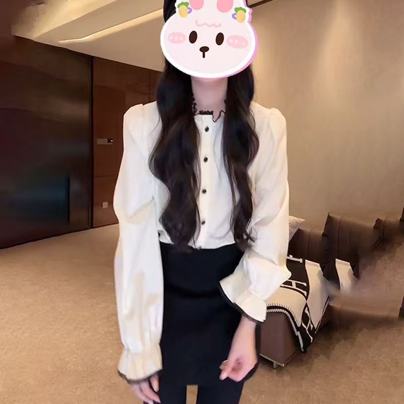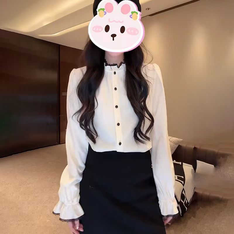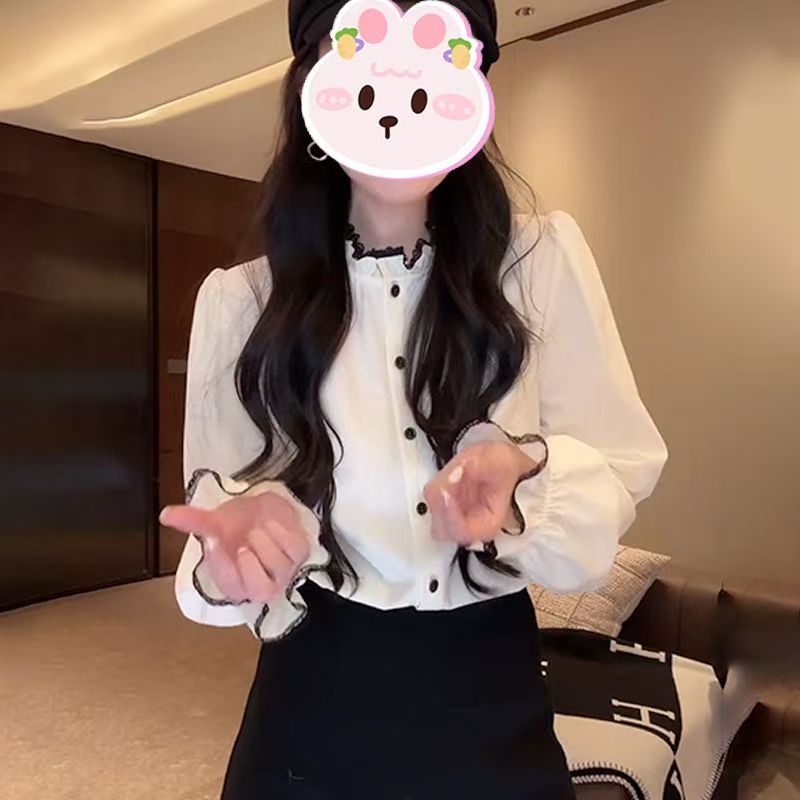 YF6848-图片色春秋时尚木耳边长袖花边领系扣复古设计感大码上衣潮