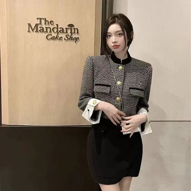 YF6851-图片色小香风秋冬加厚毛呢撞色拼接设计长袖立领排扣短装外套