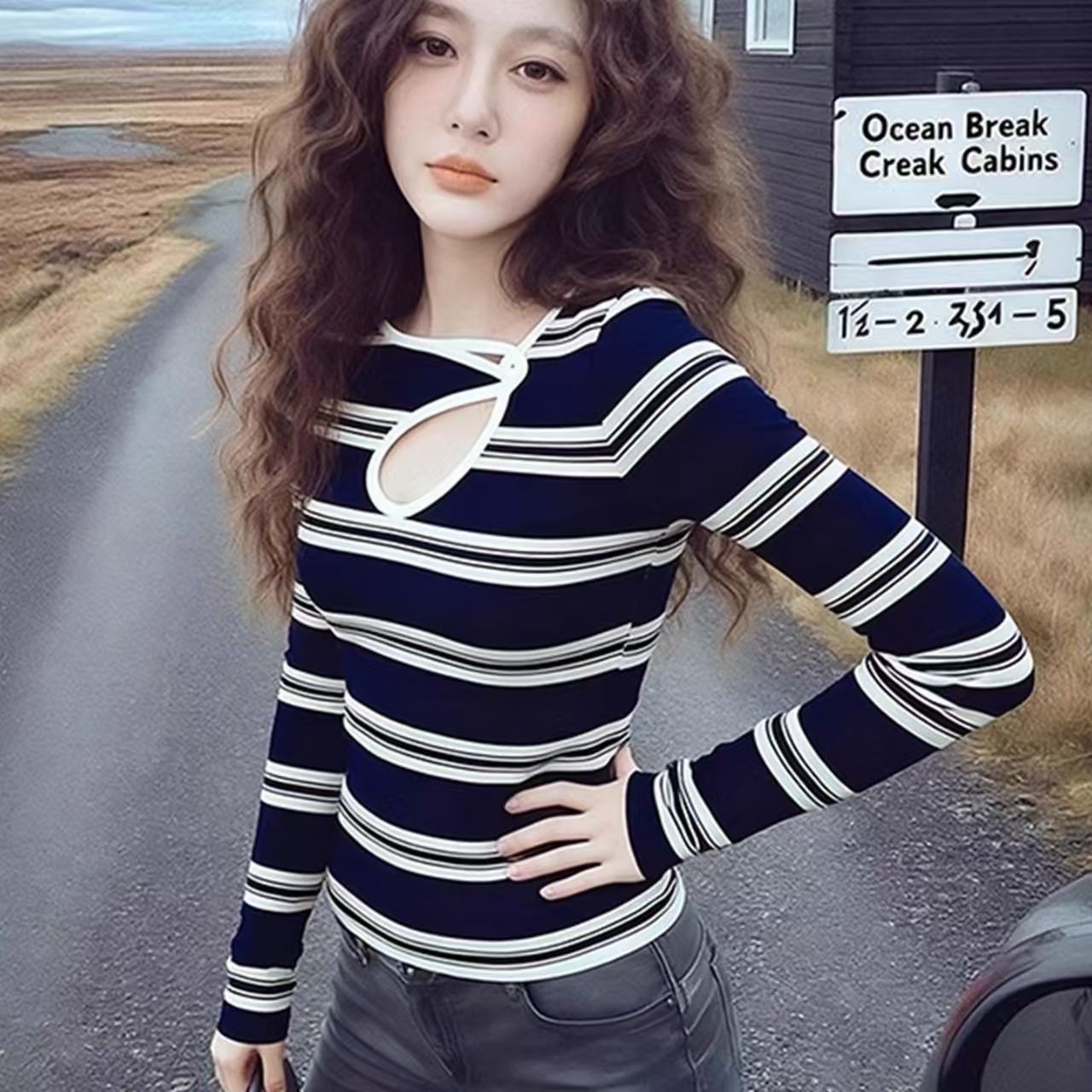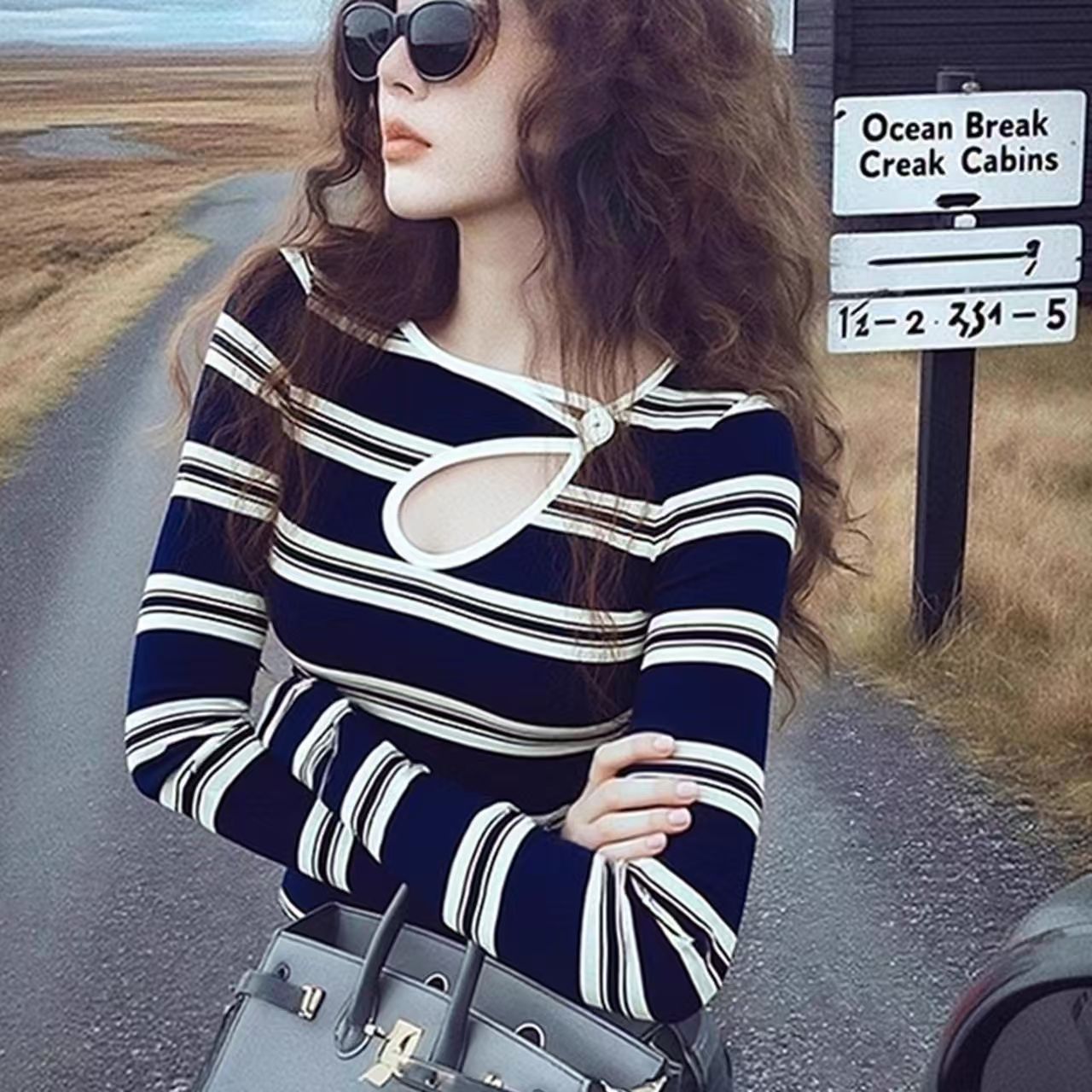 YF6854-图片色早春新款镂空黑白撞色条纹弹力显瘦长袖套头复古气质上衣