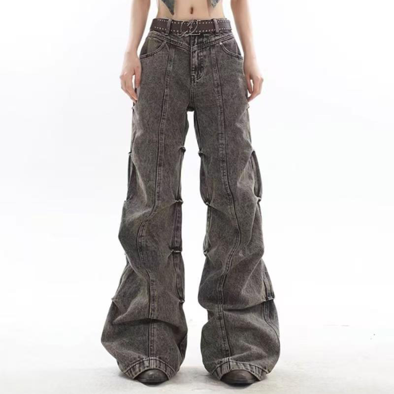 YF6856-图片色美式复古风褶折压纹小心机洗水烟灰色阔腿高街感牛仔裤