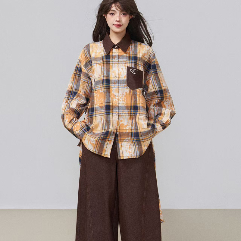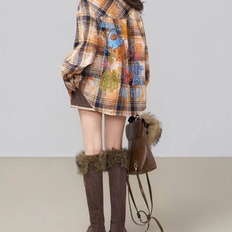 YF6859-图片色时尚洋气后背涂鸦字母印花慵懒风长袖翻领撞色小众格子衬衣